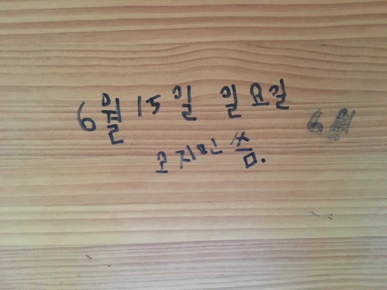 보아하니 둘은 ‘민’을 돌림자로 하는 남매 사이로 추정된다. 누나 오지민이 식탁 산 기념으로 선빵으로 서명을 했고(6.15) 이 사실을 하루 뒤(6.16)에 안 동생 오승민이 ‘나도 할 거야' 하면서 더 대범한 서명을 남긴 게 아닐까. 서로 경쟁적으로 식탁 밑에 기어들어가 목을 뒤로 꺾으면서까지 낙서하는 모습을 상상하니 식탁 아래에서 남매의 키득거리는 웃음소리가 들리는 듯하다. 새 상품이었으면 문제가 될 이 낙서들은 우리에게는 문제는커녕 더 유니크하고 더 깜찍한 포인트일 뿐이다. 아쉽게도 이 식탁을 들이고 얼마 후 코로나 19의 상황이 심각해지면서 모임을 못하고 있지만 조만간 식탁에 모여 앉아 맛있게 먹는 날이 오겠지?