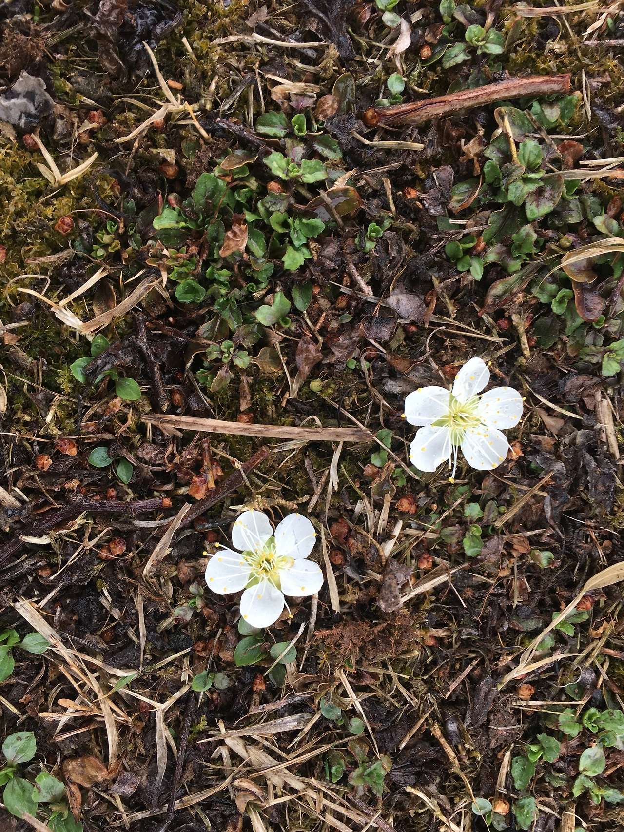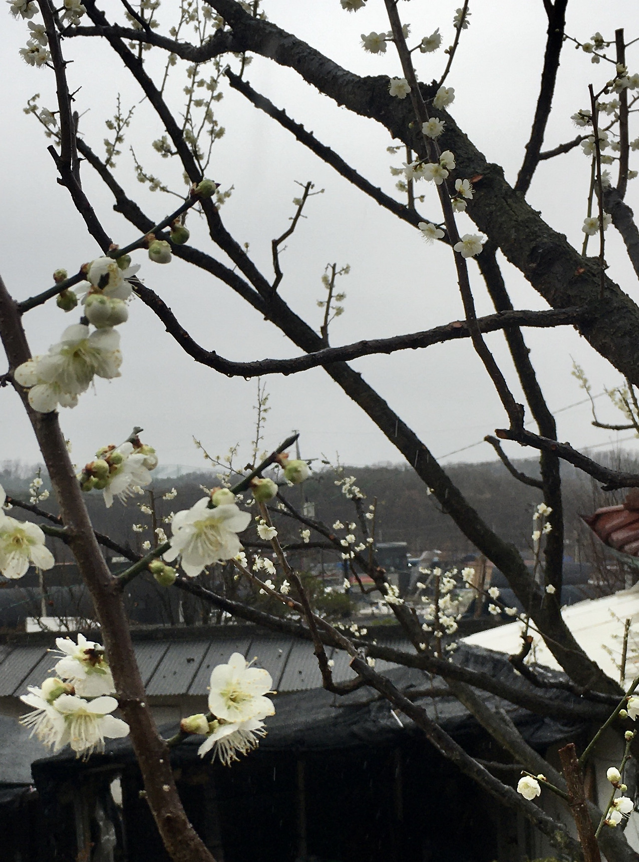 내 우산에 맞아 떨어진 어여쁜 매화꽃, 어렵사리 꽃 피웠을텐데 쏴리쏴리~