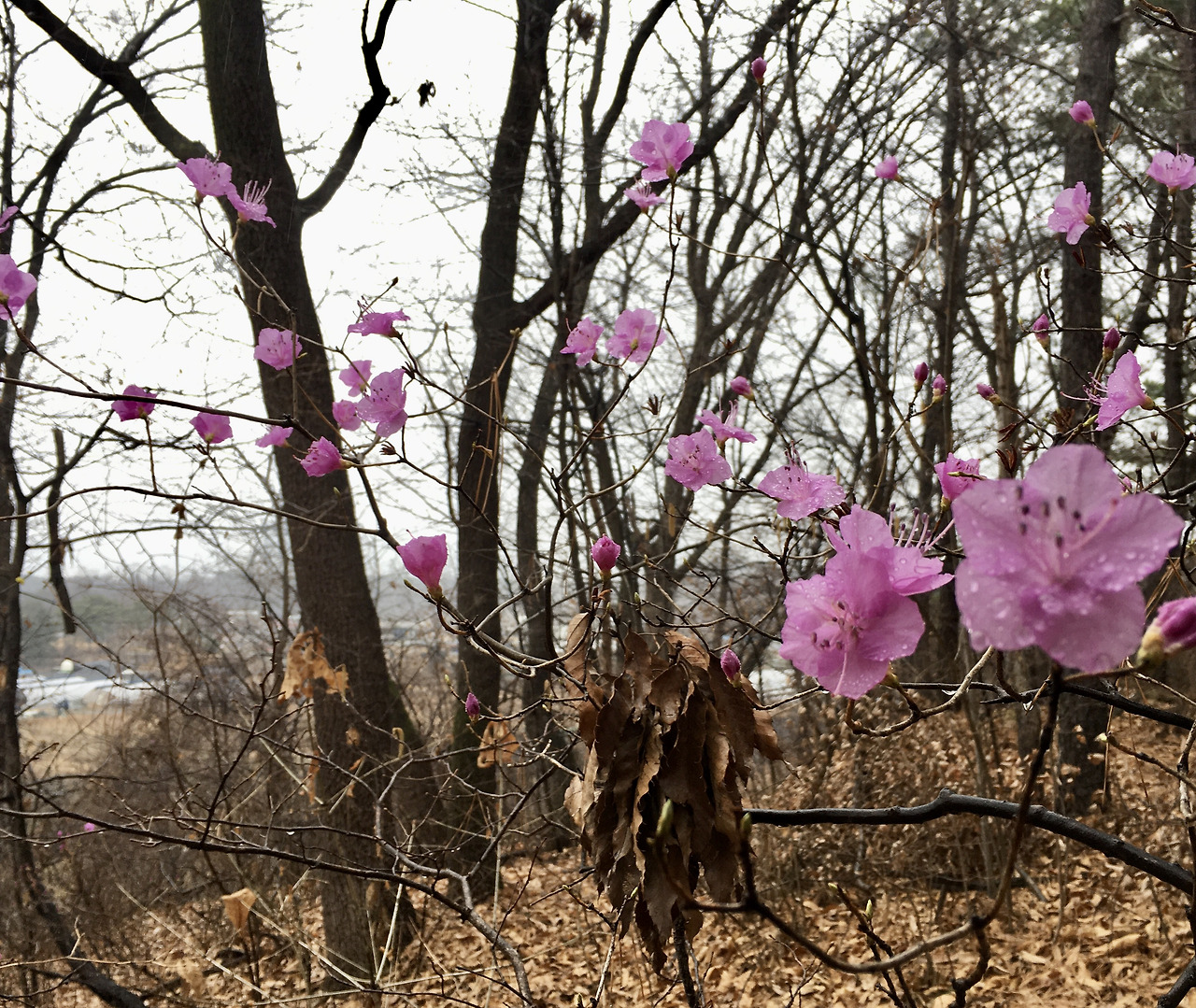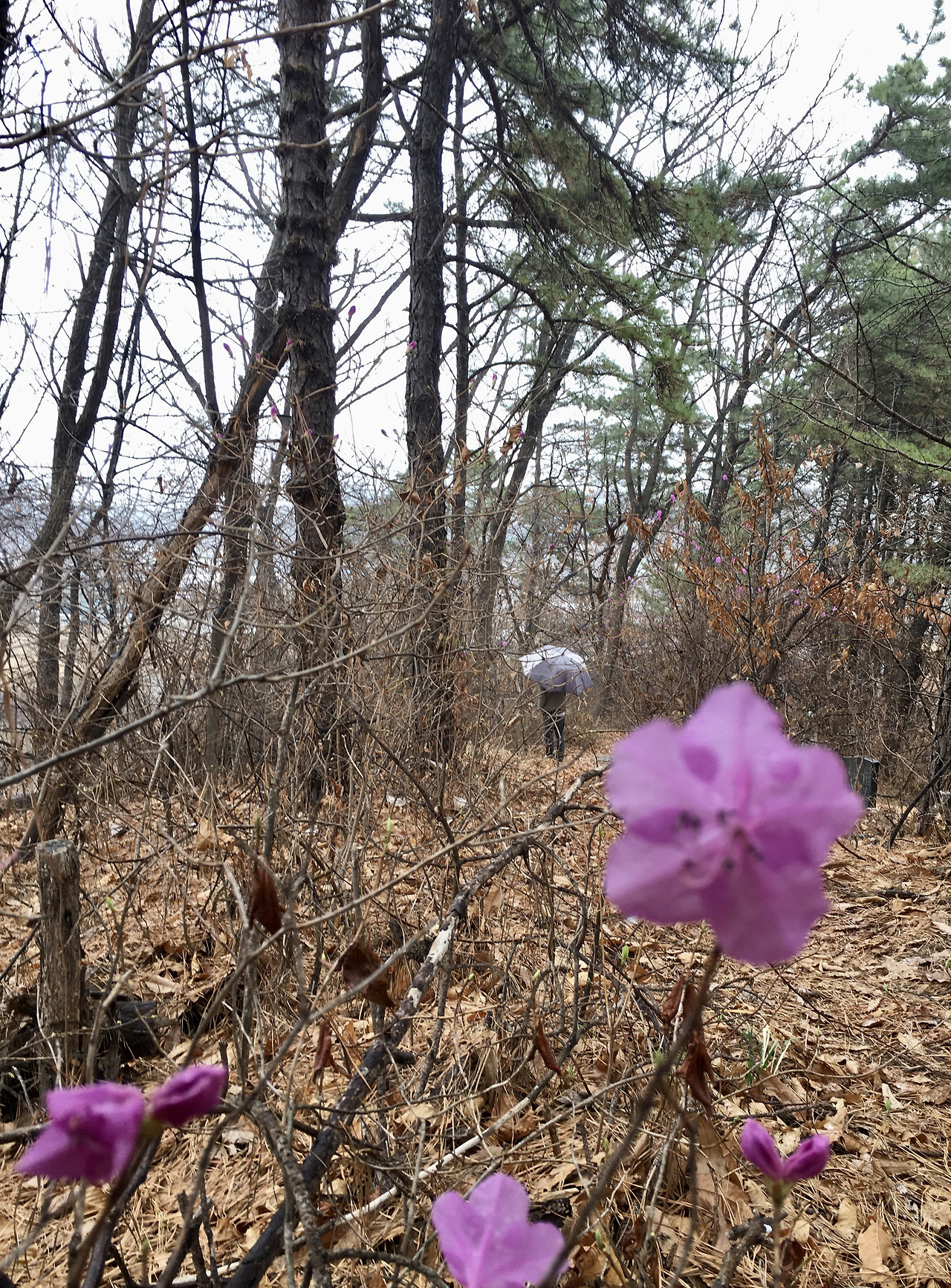 카톡! 나간지 10분이나 됐을까. 진달래 사진을 보내왔다. 이래도 안 나올텐가? 진달래에 마음이 흔들린다. 그새 쪼르르 집으로 와서 진달래 본 눈을 자랑한다. 또 자기가 심은 두릅나무에 새순이 나오고 있다며 콧노래를 부르며 둠치둠칫 춤을 추더니 다시 산에 갈 거란다. 안 따라나오면 후회할 거라면서. 에효, 못 말려! 못 이긴 척 일어나 우산을 쓰고 따라나선다. 그리고 나가자마자 꽃길이 펼쳐진다.