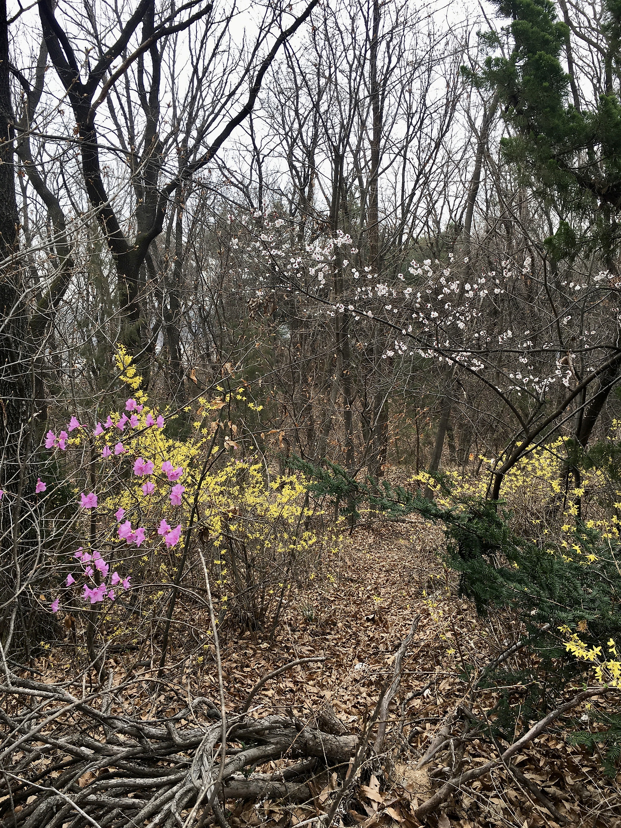 매일 같은 길을 가도 매번 다른 길이다. 특히 봄에는 하루하루가 다르고 매일매일 새롭다. 지난주 산뜻하게 예뻤던 산수유 꽃은 어느새 빛이 바래 있었고, 수줍게 군데군데 피어있던 진달래는 지천에 활짝 피어 있었다.