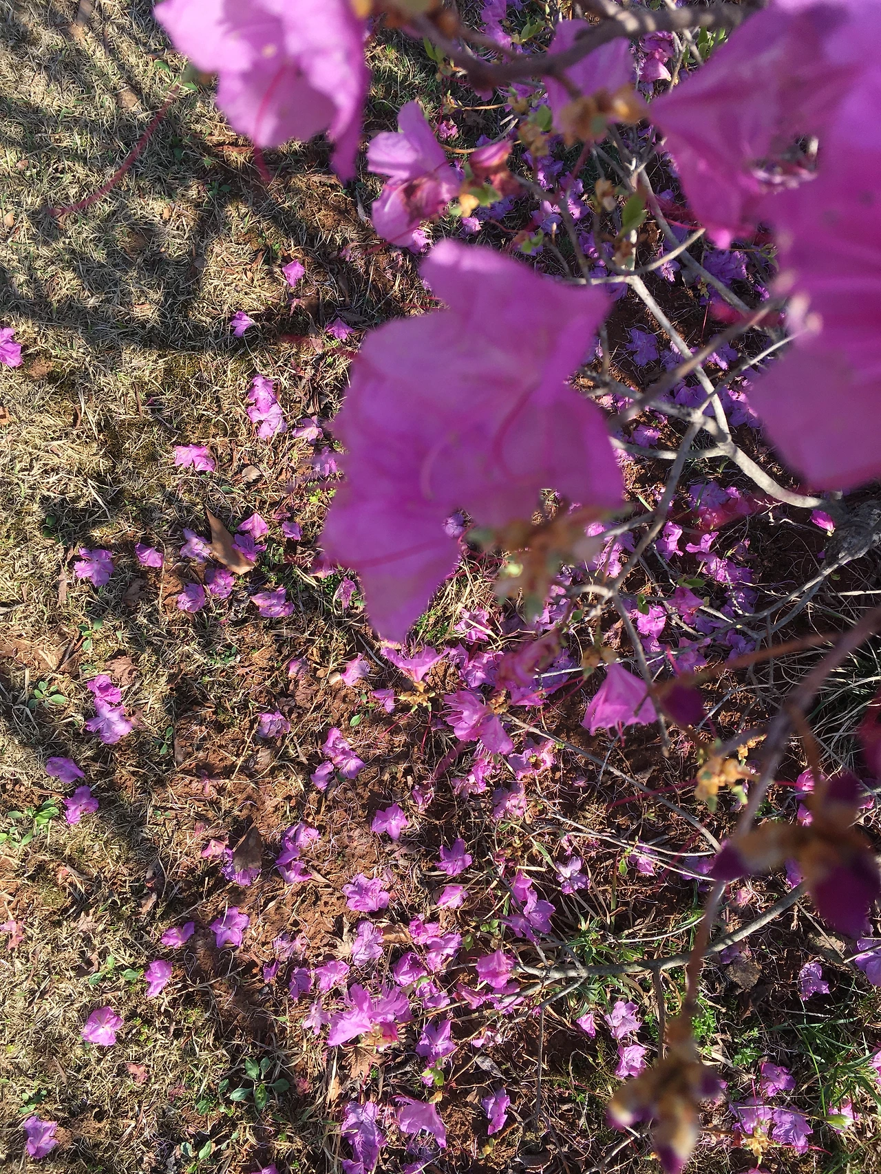 김소월의 시는 진달래꽃에 대한 상념에 절대적 영향력을 미친다. 떨어진 진달래꽃을 보면서 최근 내 마음에서 일어났던 불안함, 아픔, 슬픔, 체념, 끝내 이별의 마음을 본다. 물론 내 마음은 가정법도 반어법이 아니라는 점만 다를 뿐...