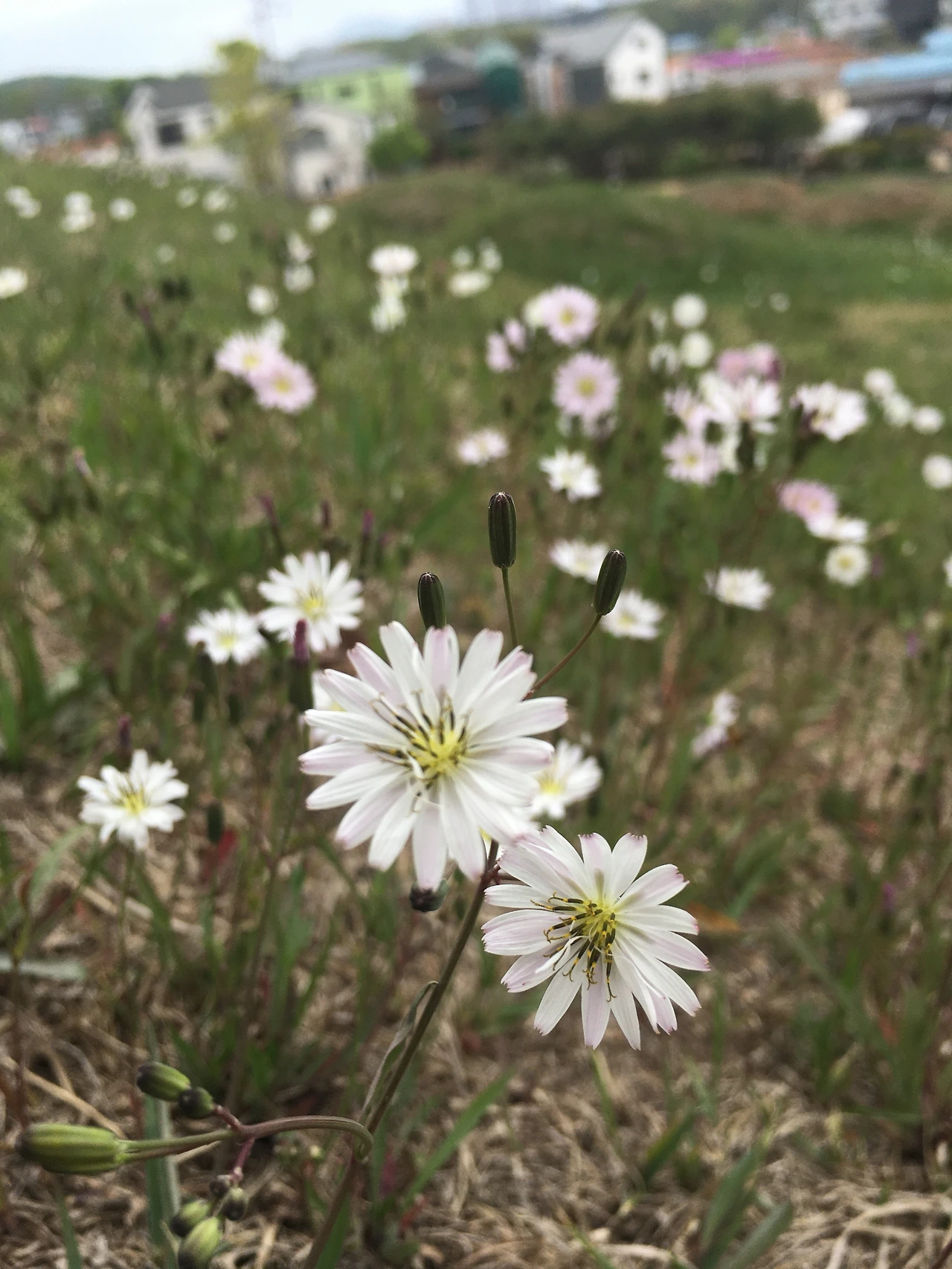 매일 가다가 딱 하루 안 갔던 거 같은데 전혀 다른 시공간으로 바뀌어있다. 보라색 제비꽃 밭이었는데 하루 만에 하얀색 씀바귀 꽃밭으로 변해있다.