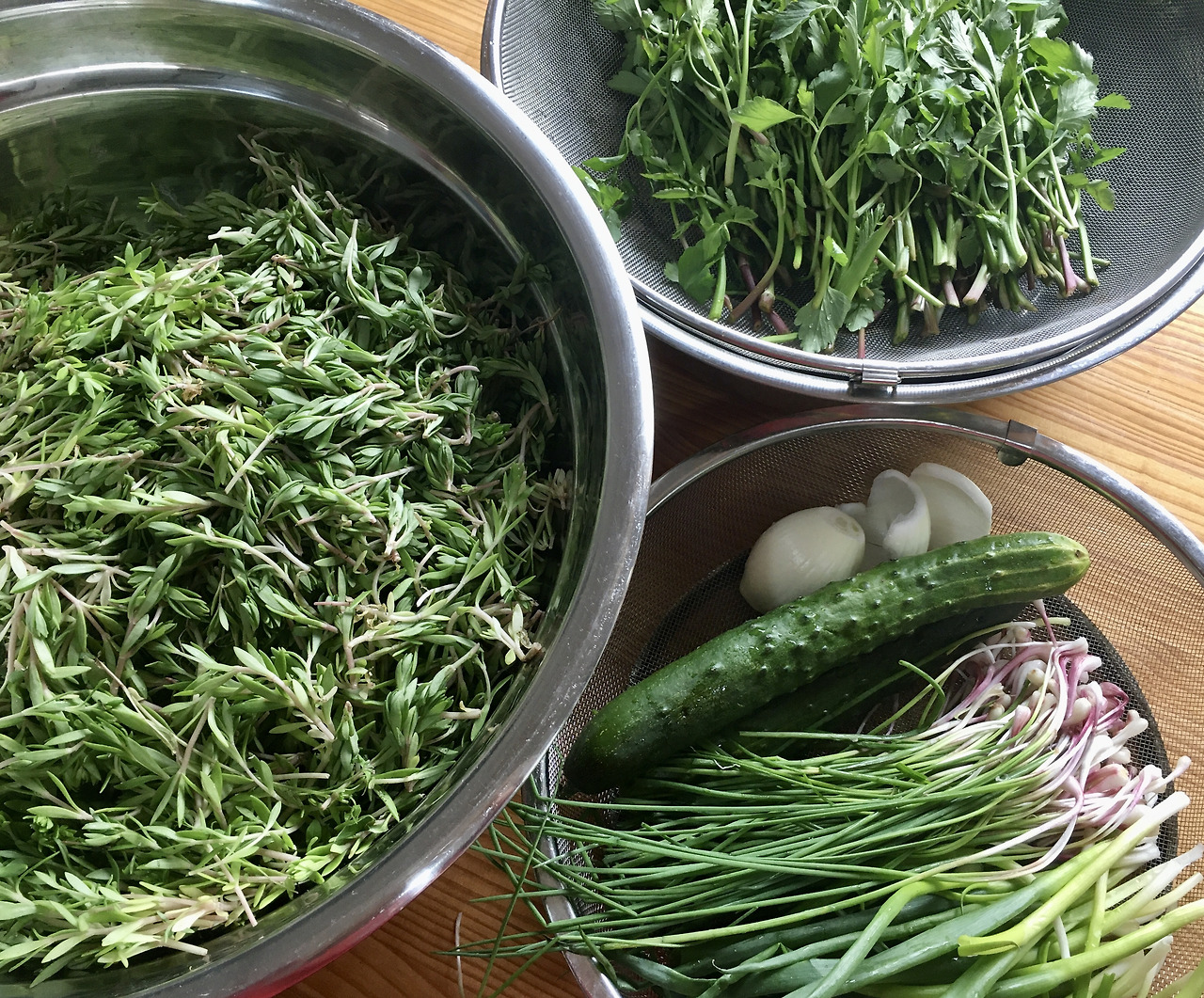 돌나물 준비는 내가 담당이다. 물김치 한통 담그려면 돌나물이 굉장히 많이 필요한데, 돌나물이 올라올 때부터 그 서식지와 성장 속도를 내가 눈여겨봐 두고 날이 더워 웃자라거나 꽃이 필 거 같으면 미리 뜯어놓기도 한다. 우리 집에서 김치를 담그기 때문에 미리 쑤어두어야 하는 찹쌀풀도 내가 미리 쑨다. 올해는 집 주변에 쪽파와 미나리가 있어서 미리 준비해두었다. 그리고 나머지 재료(오이, 당근, 고추, 마늘, 생강, 과일)는 친구가 다 사 온다. 올해는 홍고추를 안 사 와서 나한테 한소리 들었고, 나이 들어서 자꾸 깜빡한다며 봐달라고 했다. 재료 준비 방식(오이를 채 썰까 반달 썰까, 미나리를 대만 넣을까 잎도 다 넣을까, 고춧가루 농도와 단맛은 어느 정도로 할까 등등)은 레시피 주인인 나의 방식을 따르고. 간은 친구가 맡긴다. 둘이 함께 담가서 반을 나눈다. 이번엔 둘이 함께 아는 친구 것도 따로 챙겨 보냈다. 이런 것도 누군가 그럴까? 그러면 그러자! 하면서 결정된다. 그야말로 이심전심이다.