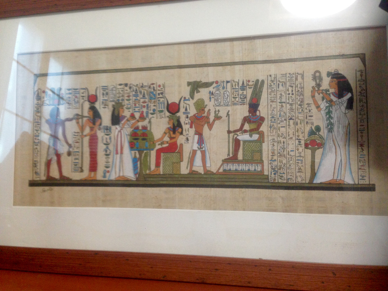 탐정이라도 된 것처럼 특별한 단서를 찾아보고자 했지만 그런 건 없었다. 뒤돌아 나가려는데 뜻밖의 물건을 발견했다. 이집트에서 기념품으로 사 왔을 법한 제법 큰 파피루스 종이그림 액자였다. 안방 방문 위에 비스듬히 매달려 있었다. 얼마나 단단히 묶어두었는지 끌어내리기가 쉽지 않았다. 백만 년 정도 쌓인 것 같은 먼지를 털어냈더니 꽤 그럴듯한 액자가 나왔다. 그 먼지 쌓인 액자를 차 트렁크에 싣고 돌아왔다.