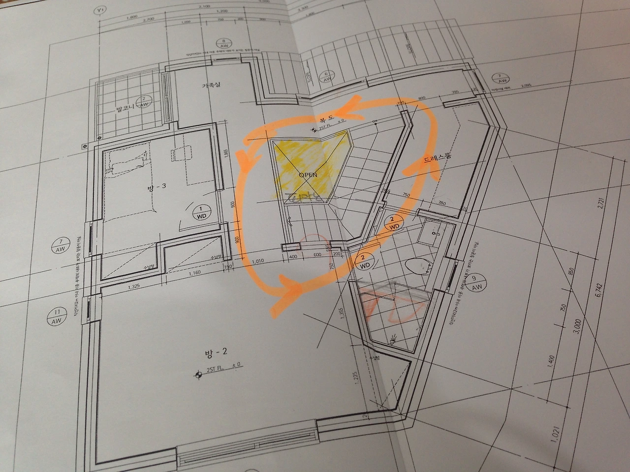 '재미'는 내가 굉장히 좋아하는 말이다. 보통 '재미난 집'이라고 표현할 때는 일반적이지 않은, 뭔가 창의적이고 유니크한 집이라는 것을 의미했다. 과연 어떤 그림이 나올까? 한편으로 기대가 되면서도 더 망할까 봐 두렵기도 했다. 하루, 이틀 기다리는 시간이 한 달, 두 달처럼 길게 느껴졌다. 드디어 새 평면도를 받았다. 정말 새로운 그림이었다. 자꾸 보다 보니 오각형의 집에서 동그라미가 보였다. 그 동그라미를 따라 눈으로 얼마나 돌고 돌았는지 도면에 보이지 않는 동그라미가 수북이 쌓여 있었다. 계단을 중심으로 돌고 도는 집이었다. 현관에서 거실, 방, 식당, 주방, 다용도실, 다시 현관으로 돌아 나온다. 바꿔 말하면 현관에 두 갈래길이 있다. 하나는 거실로 직행하는 길, 또 하나는 주방으로 직행하는 길이다. 보통은 중문을 통과해서 거실로 들어오겠지만, 장을 본 후에는 다용도실과 주방으로 바로 직행할 수 있다. 친정이니 시댁에 다녀올 때마다 밤늦게 도착하여 졸린 눈을 비비며 김치통, 쌀 포대, 사과 박스, 마을 포대 들고 날랐던 시간들이 생각났다.