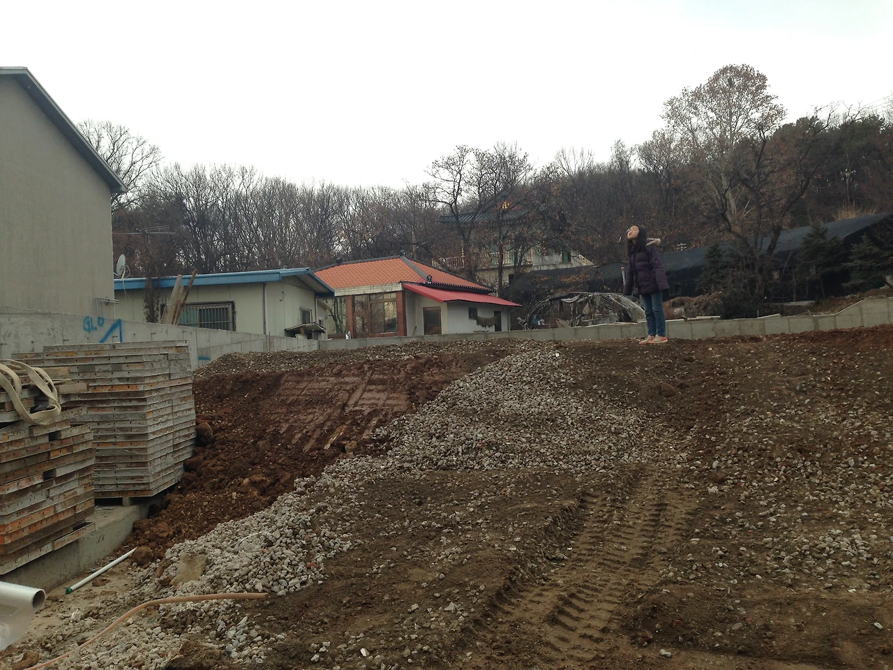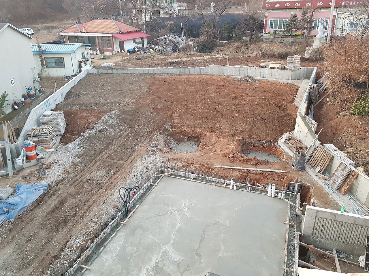 옹벽 안쪽으로 잡석과 흙이 채워지면서 집 지을 땅이 높아졌다. 높아져서 좋다기보다 위압감이 느껴졌다. 이웃 분들도 이렇게 높아지는 거였냐고 현장소장에게 볼멘소리를 했다고 한다. 공사 시작하기 전에 설계도를 보여드리며 설명을 해드렸지만 말로 듣는 것과 눈으로 보는 것은 천지차이일 수밖에 없다.