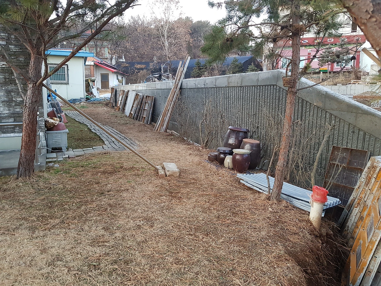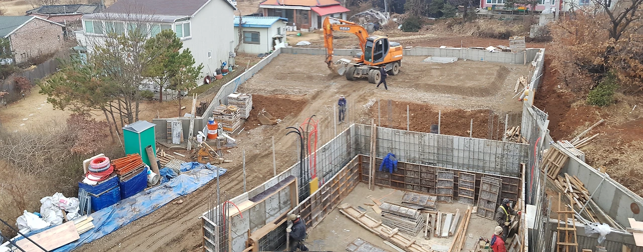 먼저 옹벽이 세워졌다. 옹벽은 잘 모르는 사람이 보면 그냥 벽처럼 보이지만, 사실 경사지의 흙이 무너져 아래쪽으로 흘러 내려오는 것을 방지하려고 세우는 구조물이다. 애초 건축설계에서는 우리 땅의 경사가 급하지 않다고 판단하여 없었는데, 인허가 과정에서 토목 보완명령이 떨어지면서 옹벽이 추가된 것이다.
