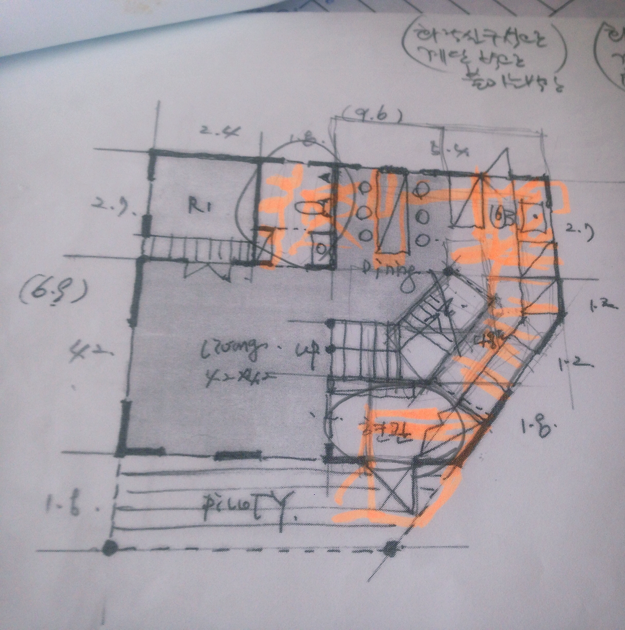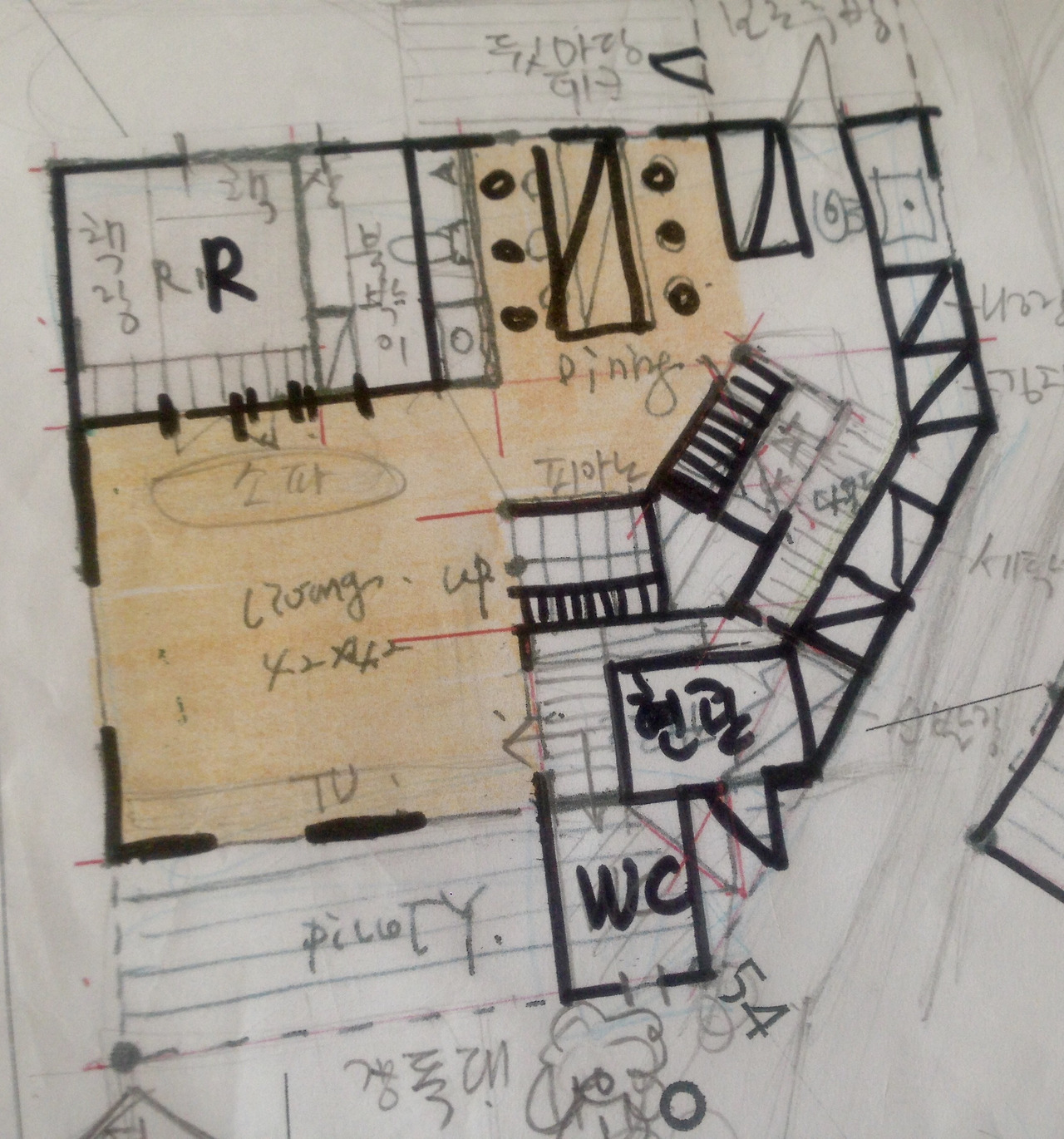 한참 고심하던 정 소장님은 평면도 어느 곳을 가리켰다. 엥? 상식에 배치되는 자리였다. 현관과 거실로 들어가는 중문 사이였다. 볕이 잘 드는 동남향이지만, 거실 중문 밖에 화장실이 있는 셈이었다. 거실을 기준으로 하면 뒷간, 현관을 기준으로 하면 앞간이었다.