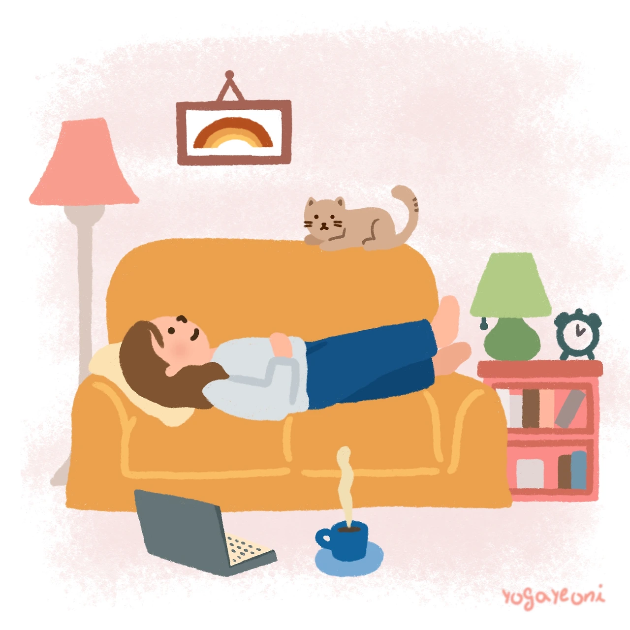 주로 매일 그림을 그리고 남는 시간에는 책을 읽거나 집안일을 한다. 일러스트 의뢰 작업이 없을 때에도 브런치, 블로그, 인스타그램에 주기적으로 개인작업을 올리고 있는데, 매번 다른 콘텐츠를 정해진 시간에 올린다는 것이 생각보다 쉬운 일이 아니어서 나름 바쁜 나날들을 보내고 있다. 그래도 좋은 점은 매일 같은 시간에 똑같은 일을 하는 체계가 아니어서 예전보다는 권태로움을 덜 느끼는 편이다. 아침 일찍부터 하루를 시작해 일찍 할일을 끝내고 싶으면 오전 8시부터 작업을 하고, 아침에 힘이 들면 저녁에 페이스를 올려 작업을 한다. 하루 루틴이 강제로 정해져 있는 시스템이 맞는 사람들도 있지만, 나는 일 하는 시간과 쉬는 시간을 내가 정하는 시스템이 좋다. 일을 위해 내가 생각한 시간만큼만 사용할 수 있기 때문인 것 같다. 회사를 다닐 때에는 비효율적으로 버려지는 시간들이 너무나도 많았다. 하지만 지금은 주말이나 저녁에도 일을 갖고 있어야 할 때가 있다는 단점이 있기도 하다. 그것은 내가 원하는 삶을 선택하기 위한 대가로 충분히 감수해야 할 점이다.