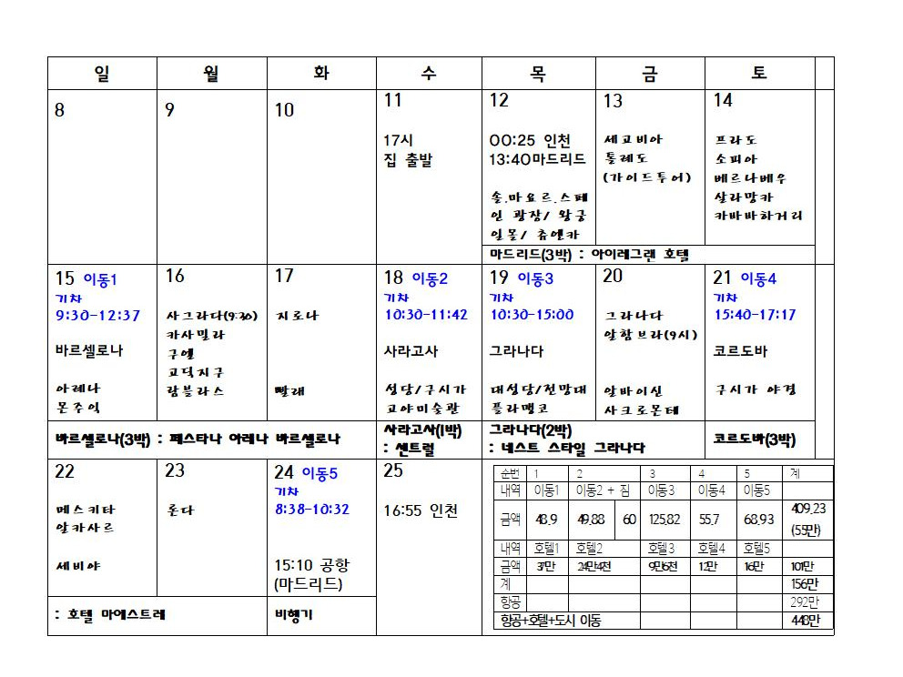 마드리드(3박)-바르셀로나(3박)-사라고사(1박)-그라나다(2박)-코르도바(3박) : 12박