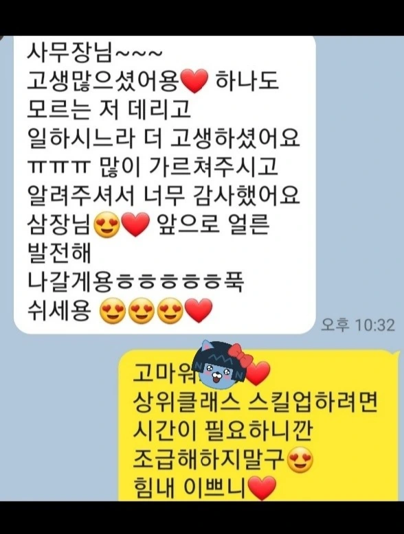 "OO아, 처음이라 서툴고, 혼도 많이 나겠지만 힘들어도 지금처럼 웃으며 열심히 배우려는 모습 보여주면 선배님들도 많이 가르쳐 주려고 할 거야. 그러다 보면 금방 일도 익숙해질 거고, 오늘처럼만 하면 돼. 고생 많았어"