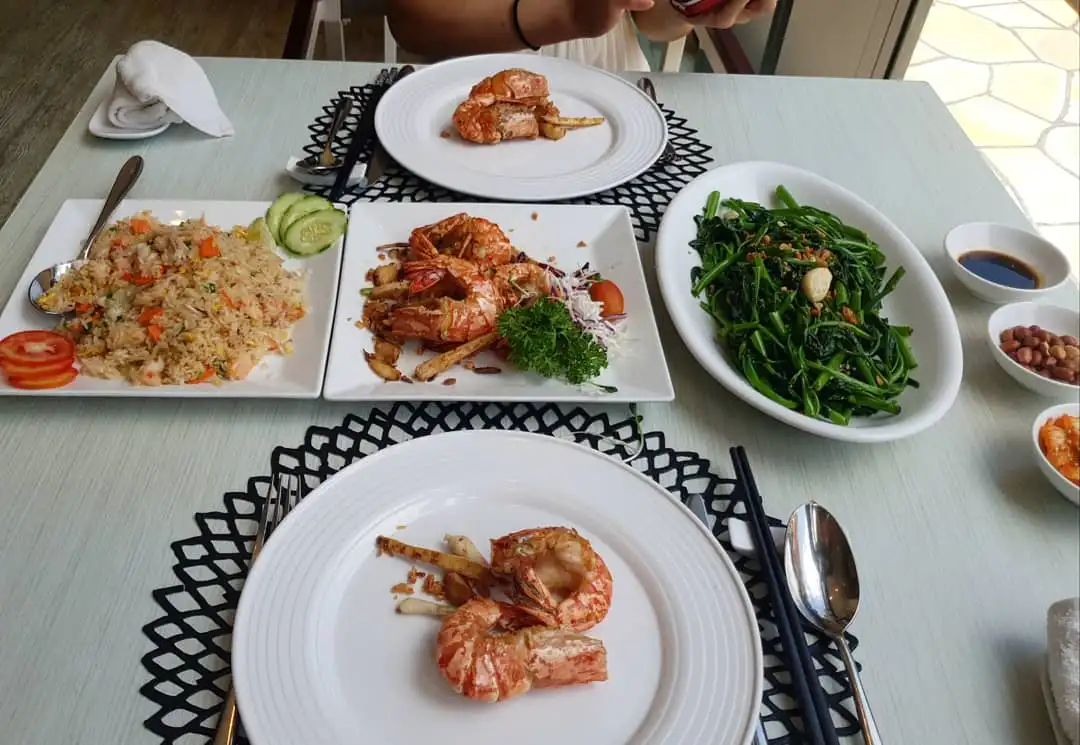 호텔에 있는 레스토랑에서 맛있는 점보 새우와 모닝글로리와 새우 볶음밥의 내가 사랑하는 조합을 저렴한 가격에 먹을 수 있다는 것.