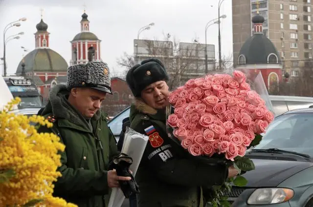 꽃다발을 들고 가는 러시아 남자들. '여성의 날'은 국가 공휴일일 정도로 러시아에서 굉장히 중요한 날이다.