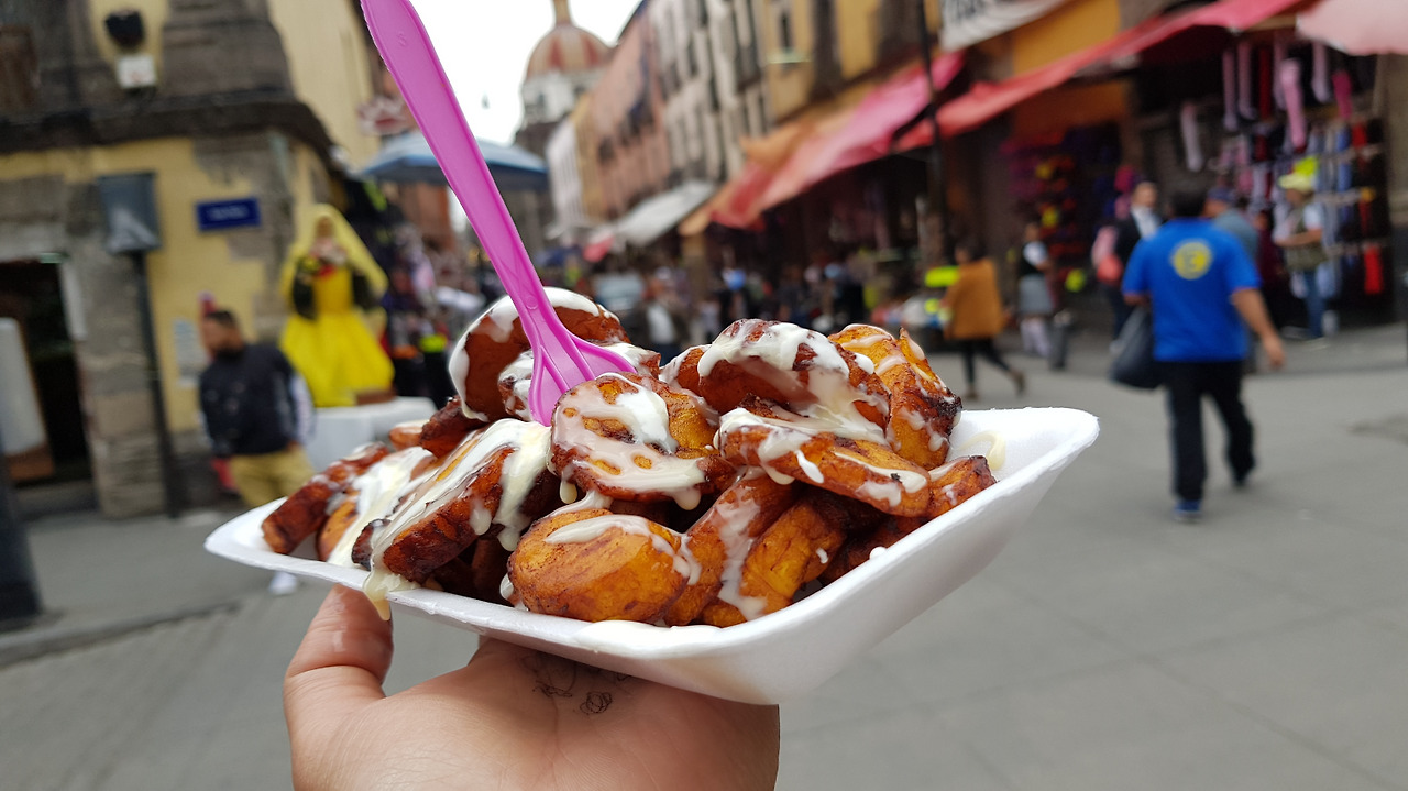 멕시코시티 대성당과 궁전, 광장 앞에 있는 거리에서 신기한 디저트를 팔길래 먹어보았다. 바나나를 튀기고 시럽에 잔뜩 버무린 후 위에는 연유를 잔뜩 뿌린 굳이 먹어보지 않아도 나의 취향임을 알 수 있었다.