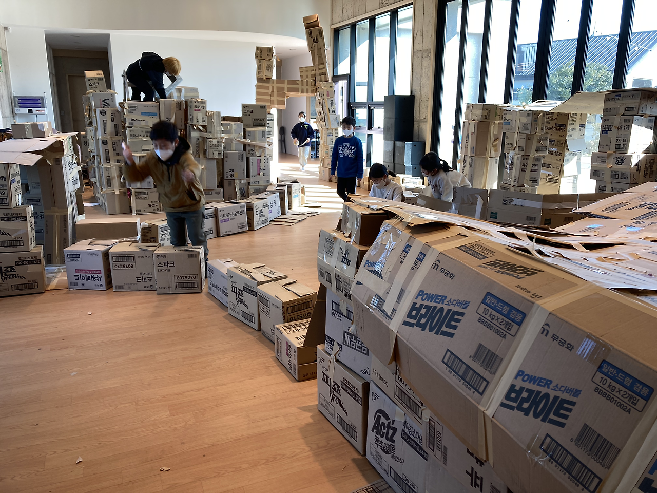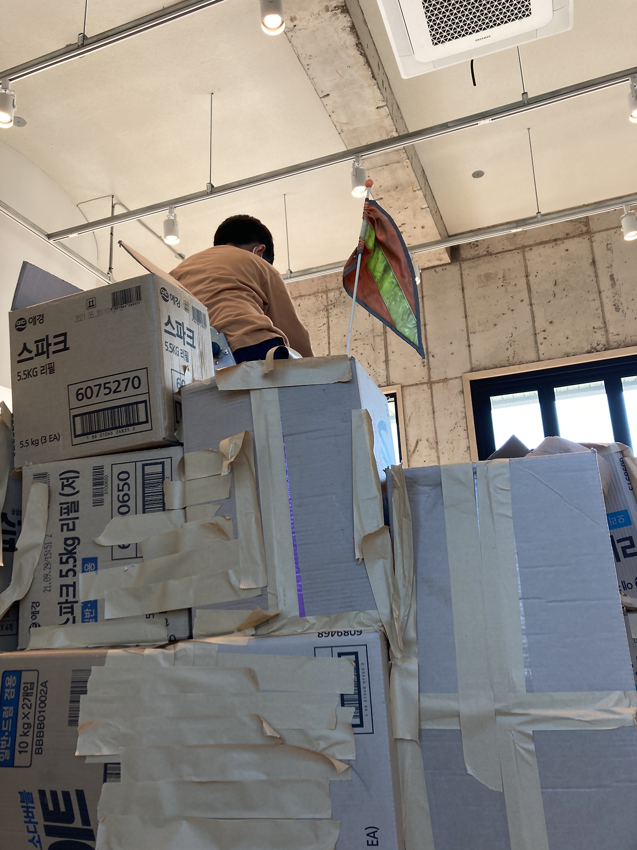 워크샵 6번동안 아이는 빠짐없이, 항상 일찍와서 신나게 몰두했다. 단지 다른 점은, 모두들 2~5명의 팀을 만들고 재잘거리면서 의견을 주고 받고 힘을 합쳐서 진행을 하는데, 이 아이는 혼자서 하고 싶다고 했다. 우선은 의견을 존중하고 그렇게 하도록 했다. 그리고 천천히 함께 하게 되는 기회를 찾아 연결해 주는걸 나의 숙제로 삼았다. 다른 팀들이 시끌시끌 작업하는동안 조용히, 자신의 계획대로 꼼꼼하게 자신의 아지트를(집을) 만들었다.