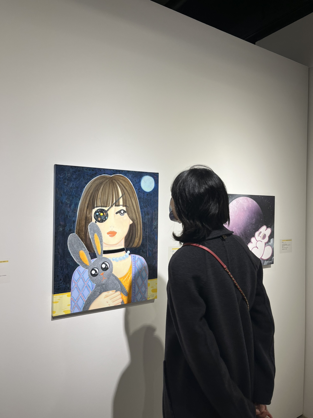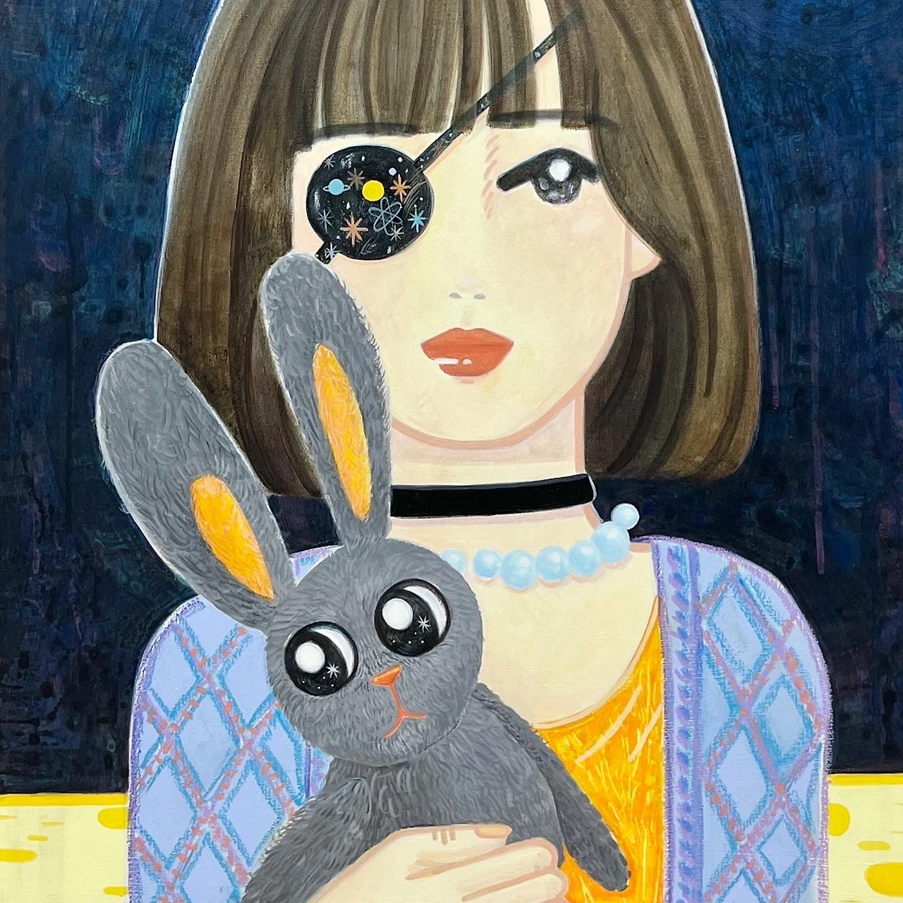 <Black rabbit in the moon>은 모모킴 특유의 따듯하고 섬세한 붓질로 완성되었다. 특히, 스웨터의 짜임은 사랑하는 사람을 위한 마음이 가득 담겨있다. 이 문양은 ‘아란 무늬’로, 아일랜드 북서쪽에 위치한 아란 제도에서 거친 겨울 바다에 나가는 가족이 무사하기를 바라며 짠 무늬이다. 어선의 튼튼한 로프를 연상시키는 무늬는 안전과 행운을 기원하고, 다이아몬드 무늬는 부와 번영을 의미하는데, 작가는 이러한 바램이 담긴 문양을 캔버스에 자수 넣듯 한 땀 한 땀 그리며 그들이 가졌던 마음 그대로, 사랑하는 이들의 안전과 행운, 행복을 기원한다.