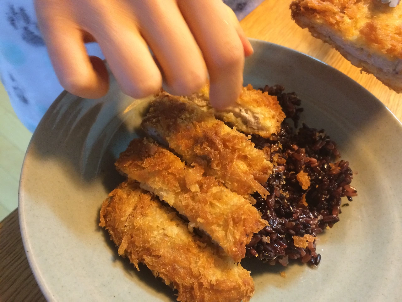 (다 된 돈까스에 야채와 육수 얹기)