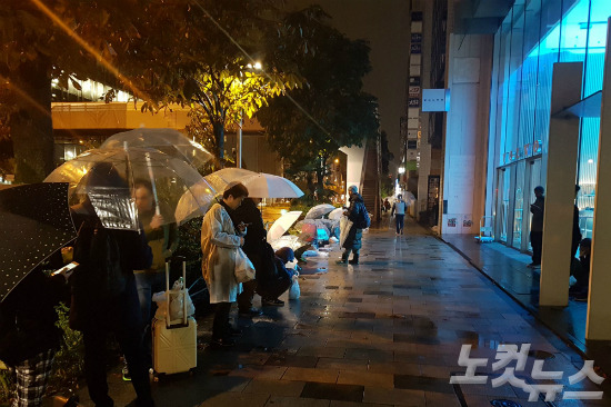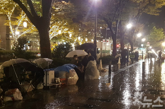 패딩 점퍼에 목도리를 두르고, 캠핑용 의자에 앉아 담요로 몸을 꽁꽁 싸맨 이들은 갑자기 쏟아진 비에 비닐까지 머리에 덮어쓰고 연신 오들오들 떨면서도 자리를 떠나지 않았다.
