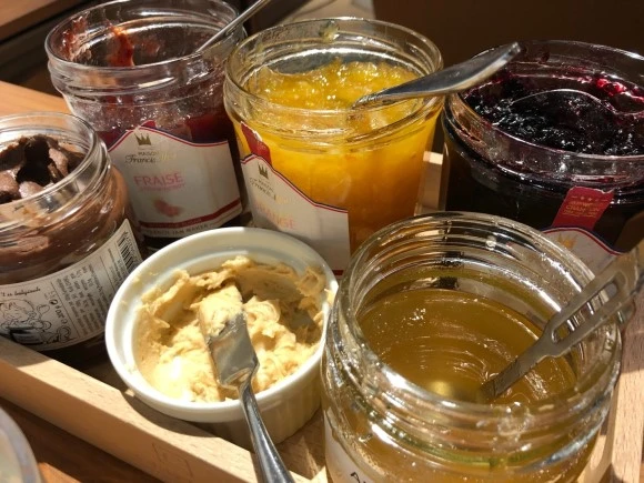 왼쪽 위부터 스트로베리/오렌지머멀레이드/블랙베리/초콜릿/피넛버터/허니
