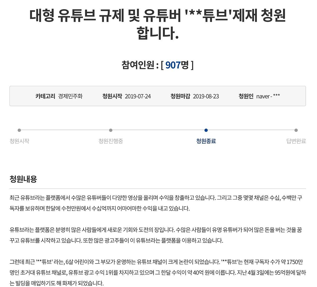 6살 유튜버가 95억원짜리 강남 빌딩을 사들였단 소식은 모두의 입을 쩍 벌어지게 만들었다. 누군가는 부러워하고, 질투도 하고, 또 누구는 허탈감과 공허감을 느끼게 만들었다. "국민들이 상대적 박탈감을 느끼지 않도록 이러한 대형 유튜브 채널이 일정 이상의 수익을 내지 못하도록 해달라"는 청와대 민원까지 등장했다.