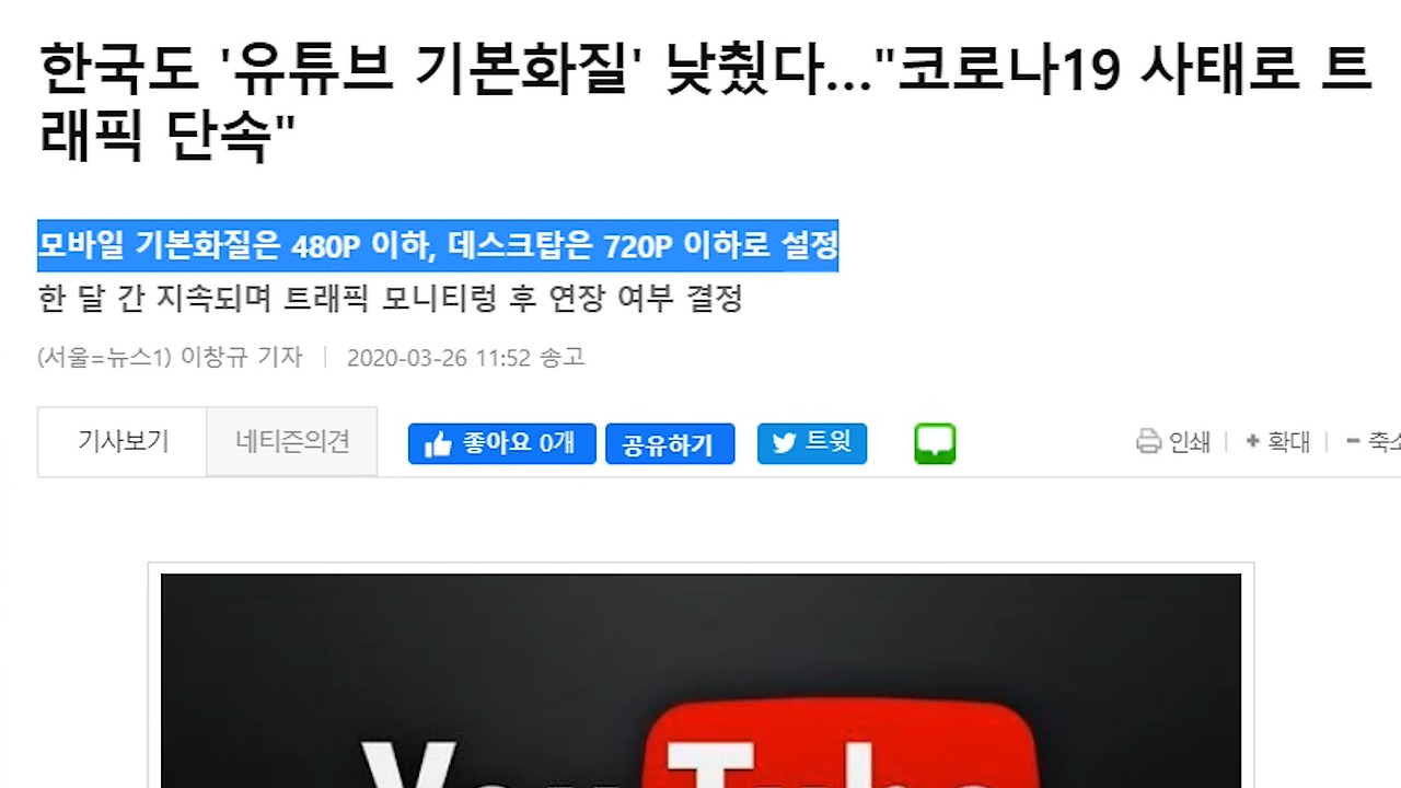 구글이 지금 유튜브 스트리밍 영상을 일반화질로만 제공하고 있거든요. 코로나 사태로 전 세계적으로 재택근무자가 늘면서 인터넷 사용이 급증했고, 이로 인해 네트워크망이 붕괴될 수 있어서 화질을 낮췄다고 합니다.