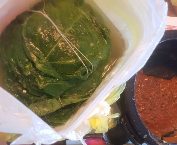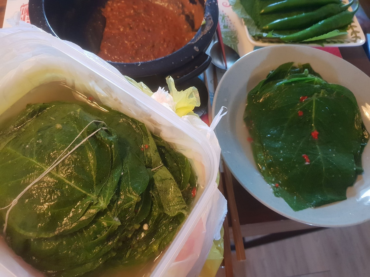 냄비만한 통 속에 가득한 콩잎, 밥공기만한 돌로 눌러져 국물(?)이라 해야 하나, 콩잎 육수(?)속에 담가져 있었다. 돌을 사뿐히 드러내니, 콩잎 한 움큼이 하얀 실 한가닥으로 돌려 묶여 있었다.