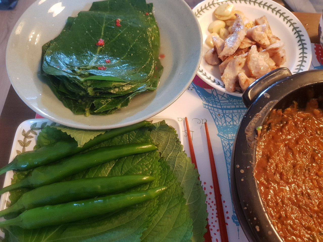 콩잎이 맛있다며 쌈 싸 먹고, 쌈 싸 먹다 배부르면 밥은 빼고 콩잎만 강된장에 푹푹 찍어 먹다가 "가스나야, 그래 묵지 말랬재. 그러면 된장 맛이 변한다고 안 캤나" 하며 한 대씩 맞기도 했지만 "된장 다 무면 되잖아" 절대 굴하지 않던 먹 고집.