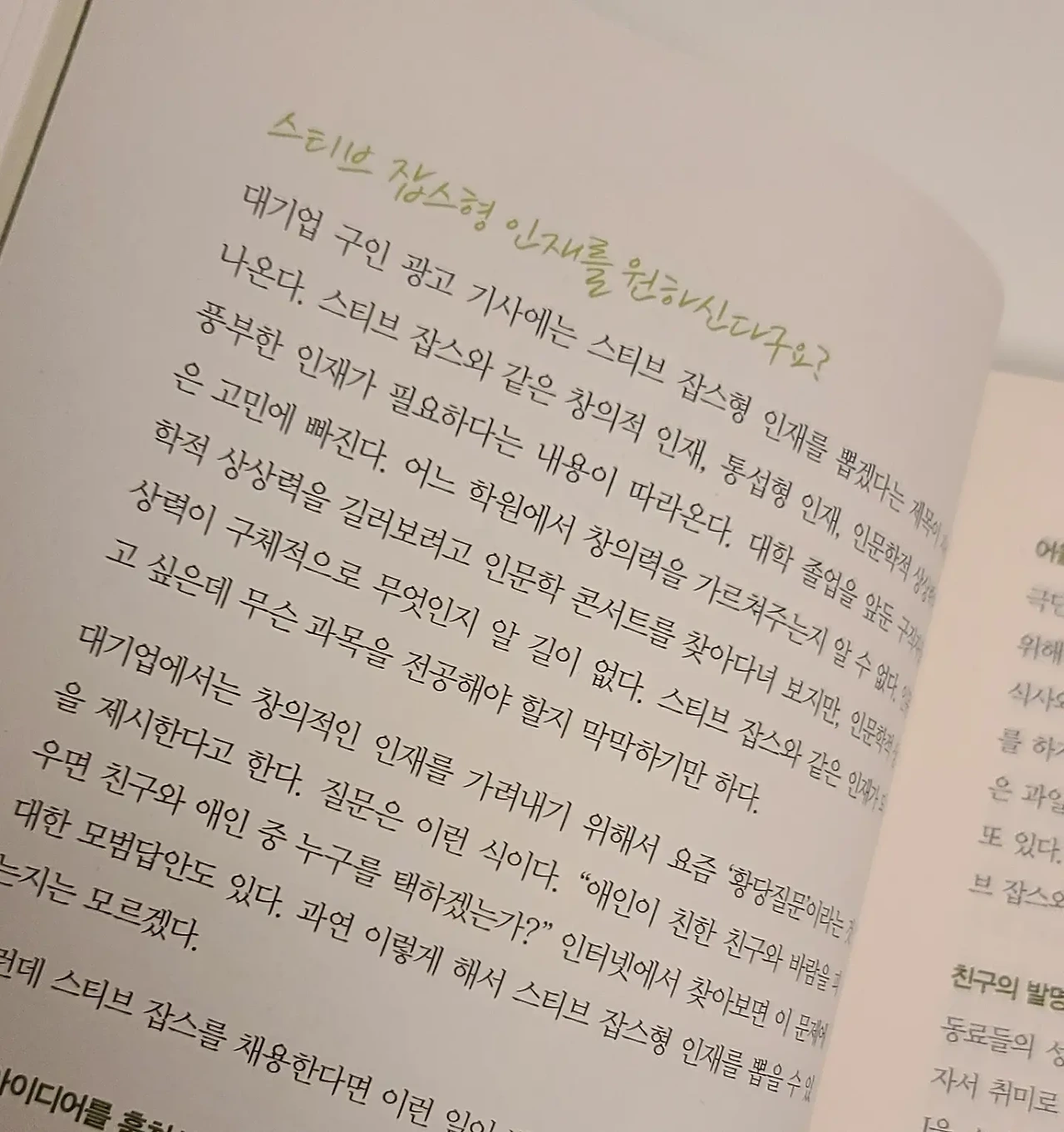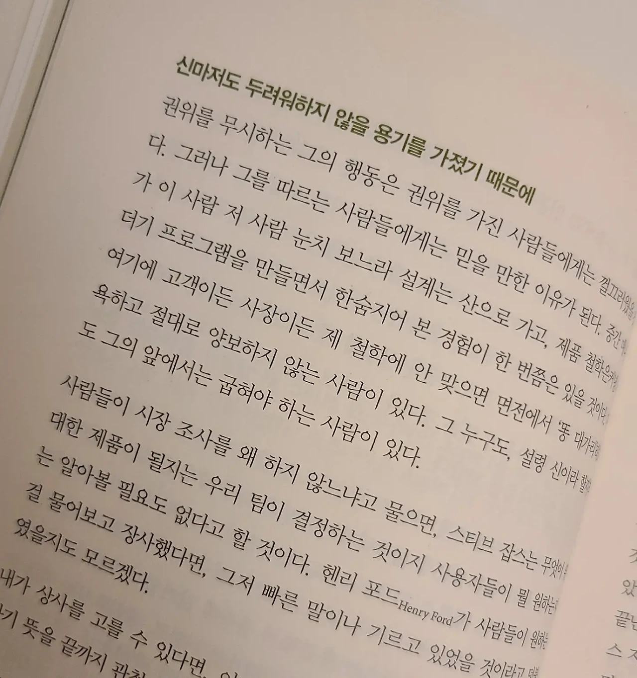 책의 첫 장은 스티브 잡스에 대한 뒷담화로 시작합니다. 모두가 스티브 잡스를 꿈꾸고 기업에서도 스티브 잡스형 인재를 뽑는다지만, ‘스티브 잡스가 정말 내 팀원이 된다면 회사가 제대로 돌아갈 리 없을 것’이라는 아찔한 상상을 하며 저자는 얘기를 펼칩니다.