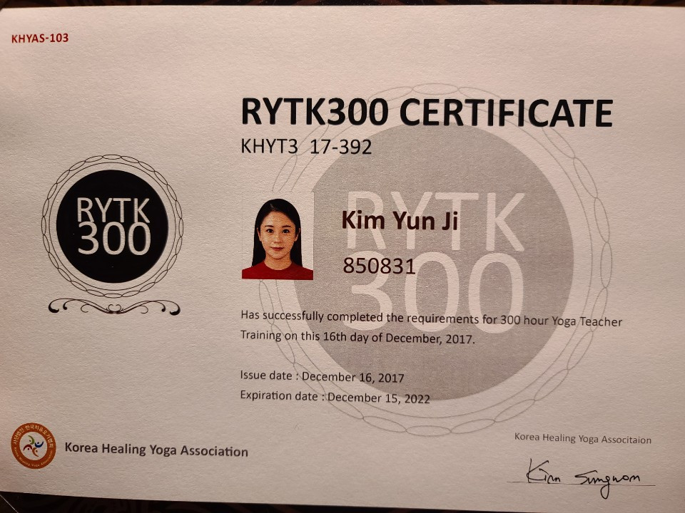 하기로 결심한 거, 또 어차피 시간을 들일 거면, '그 시간과 노력이 조금 더 가치나 효력을 가질 수 있게 해 보자' 그렇게 생각했던 거죠!! 그래서 6개월간 매주 토요일 5시간씩 투자하고 평일에도 틈틈이 요가원에 들리면서 지도자 과정을 수료했습니다. 그리고 1박 2일 일정의 수련 및 시험을 치르고 당당히 자격증을 땄어요. 인터내셔널 자격증으로요 ㅎㅎ(미래에 이민 가더라도 먹고살 수 있도록)