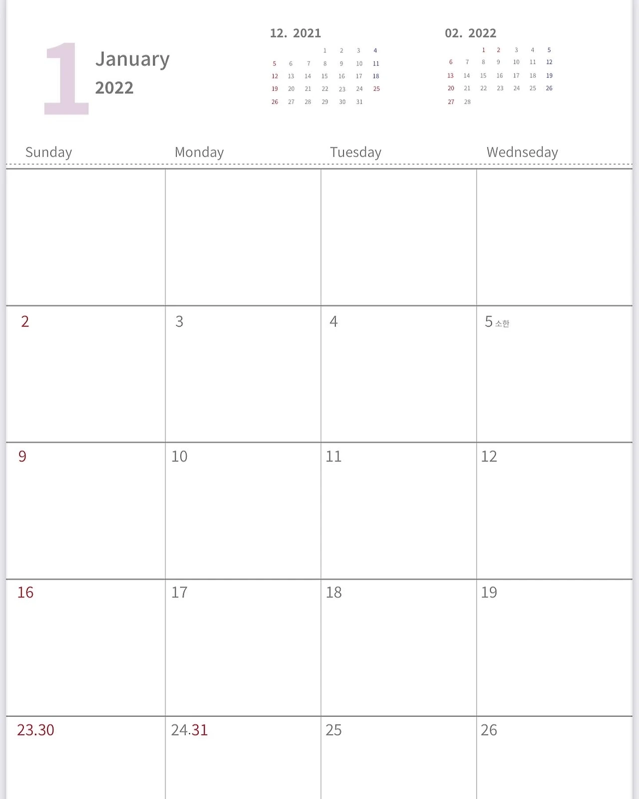 이번에 제작하는 건 내년에 본격 제작을 앞둔 베타 버전입니다. 12월에 제작되는 만큼 2021년 12월분은 없고, 2022년 1월부터 시작해요 ^^ 그리고 내년 다이어리를 위해 2022년 12월까지만 딱 담았습니다. 디자인은 의뢰했지만 남은 작업들은 혼자 다 했어요.ㅠㅠ