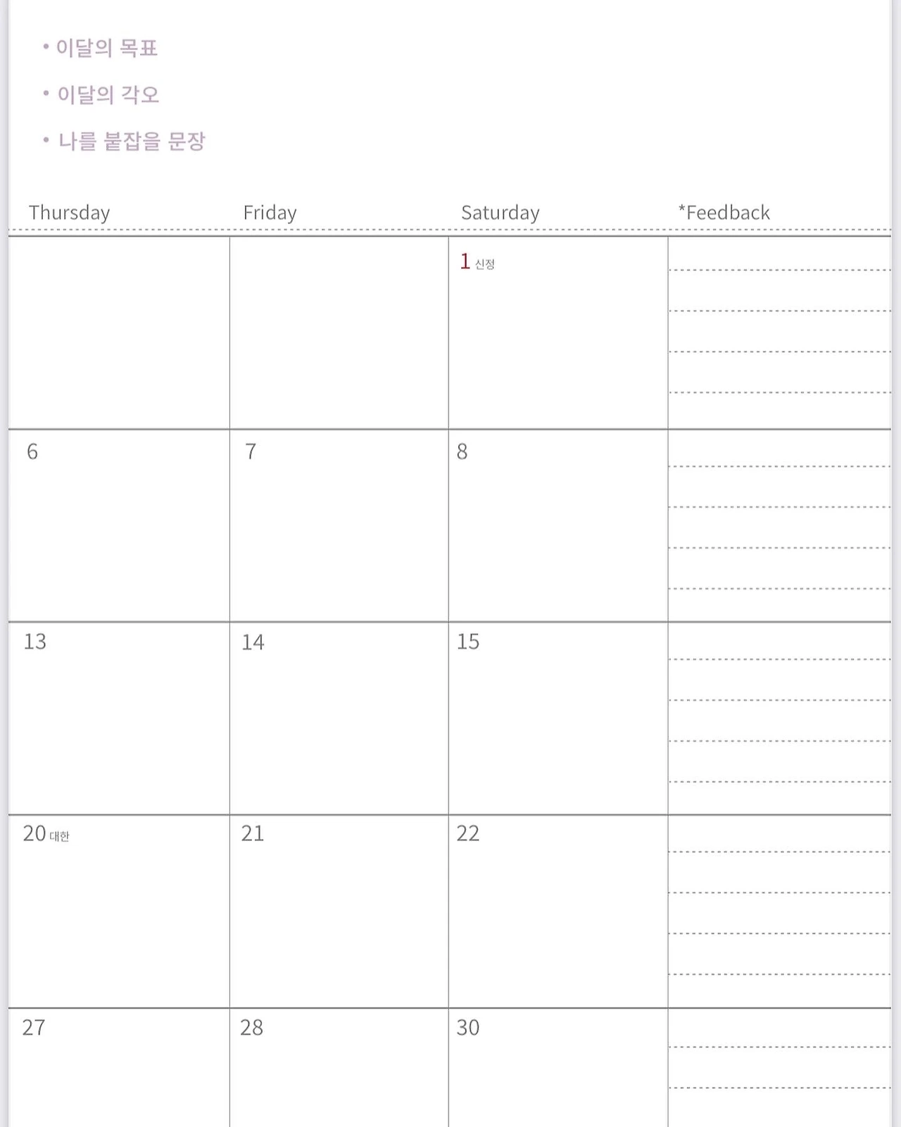 다이어리는 1년에 한 권 사는 거잖아요. 써보시고, sns에 많이 알려주시고 애정 어린 피드백도 많이 부탁드려요. “이런 건 빼는 게 좋겠다, 이게 더 있었으면 좋겠다. 칸이 너무 좁다” 등의 다양한 의견 받아서 부족한 부분 보완하고 내년에 멋지게 만들게요. 디자인도 제가 전문가가 아닌지라, 많은 의견 부탁드립니다. 주시는 의견 많이 받아서 내년엔 더 멋지고 완벽한 디자인과 퀄리티로 와디즈 등에서 펀딩해 주문제작해보려 해요!!