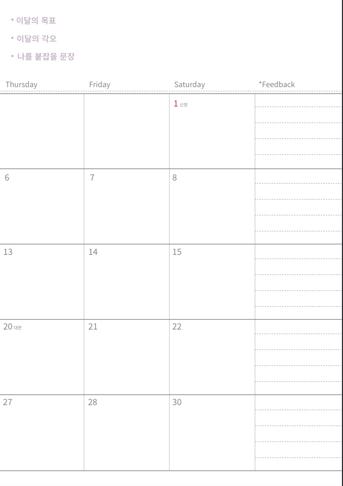 다이어리는 1년에 한 권 사는 거잖아요.!! 써보시고, sns에 많이 알려주시고 애정 어린 피드백도 많이 부탁드려요. “이런 건 빼는 게 좋겠다, 이게 더 있었으면 좋겠다. 칸이 너무 좁다” 등의 다양한 의견 받아서 부족한 부분 보완하고 내년에 멋지게 만들게요. 디자인도 제가 전문가가 아닌지라, 많은 의견 부탁드립니다. 주시는 의견 많이 받아서 내년엔 더 멋지고 완벽한 디자인과 퀄리티로 와디즈 등에서 펀딩해 주문제작해보려 해요!!