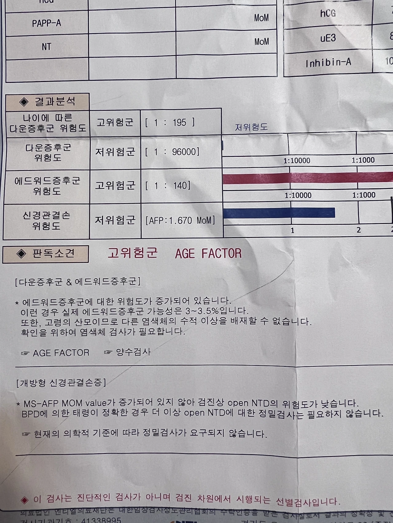 1:140이면 확률적으로 아주 위험한 정도는 아니고, 산모 나이가 있기 때문에 아이는 괜찮은데, 이렇게 나왔을 수도 있다고 하셨다.(나는 85년생이다. 실제로 '고위험군' 옆에 'Age Factor'라고 적혀 있었다. )