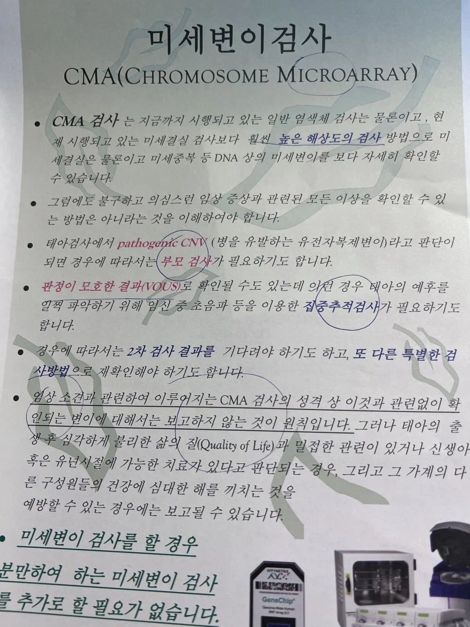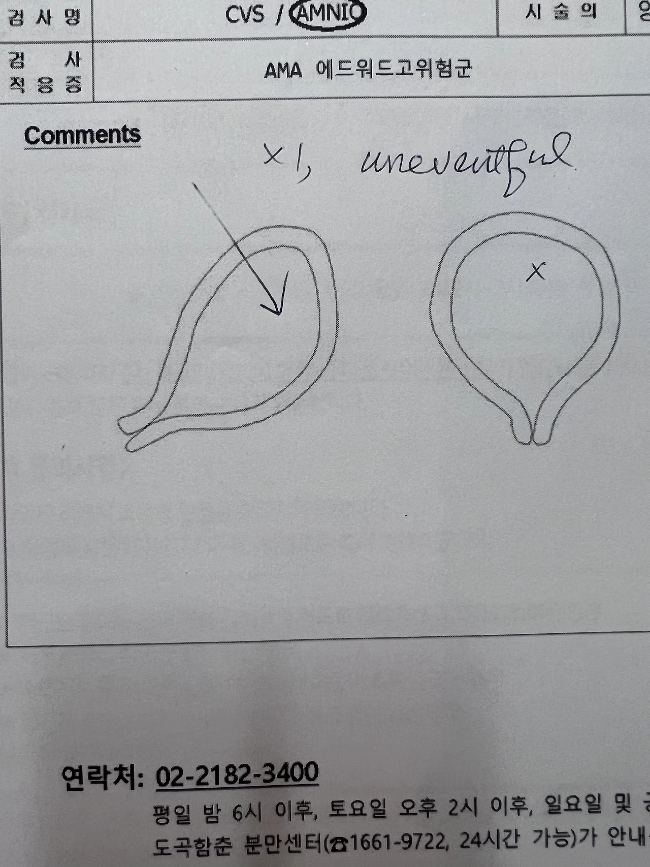 우선 접수하고, 혈압/몸무게/소변 검사를 한 뒤 양수검사에 대한 설명을 들었다. 간단히 말하면 양수의 일부를 체취해, 염색체 이상 여부를 검사하는 것이었다.
