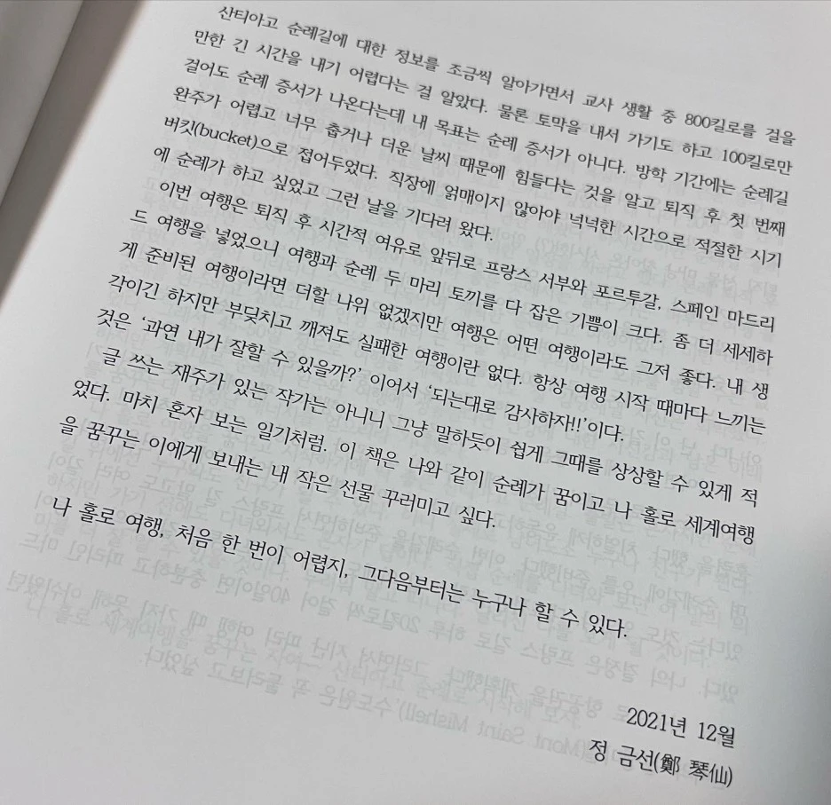 제목만 보고서 많은 분들이 성지순례 책이냐고 물어보곤 하는데, 정확히는 <60대 할머니의 산티아고 순례 여행일기>다. 수피아여고에서 40년간을 학생들과 웃고 울었던 정금선 교사가 퇴직 이후 산티아고 순례길과 주변국을 여행한 46일간의 기록이 담겼다.