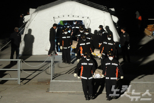 전남 진도항으로 구조대원들이 수습된 시신들을 운구하고 있다. (사진=윤성호 기자)
