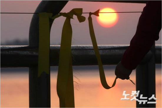 전남 진도항에서 한 자원봉사자가 저무는 바다 앞에서 희생자들을 애도하는 노란 리본을 잡고 있다.