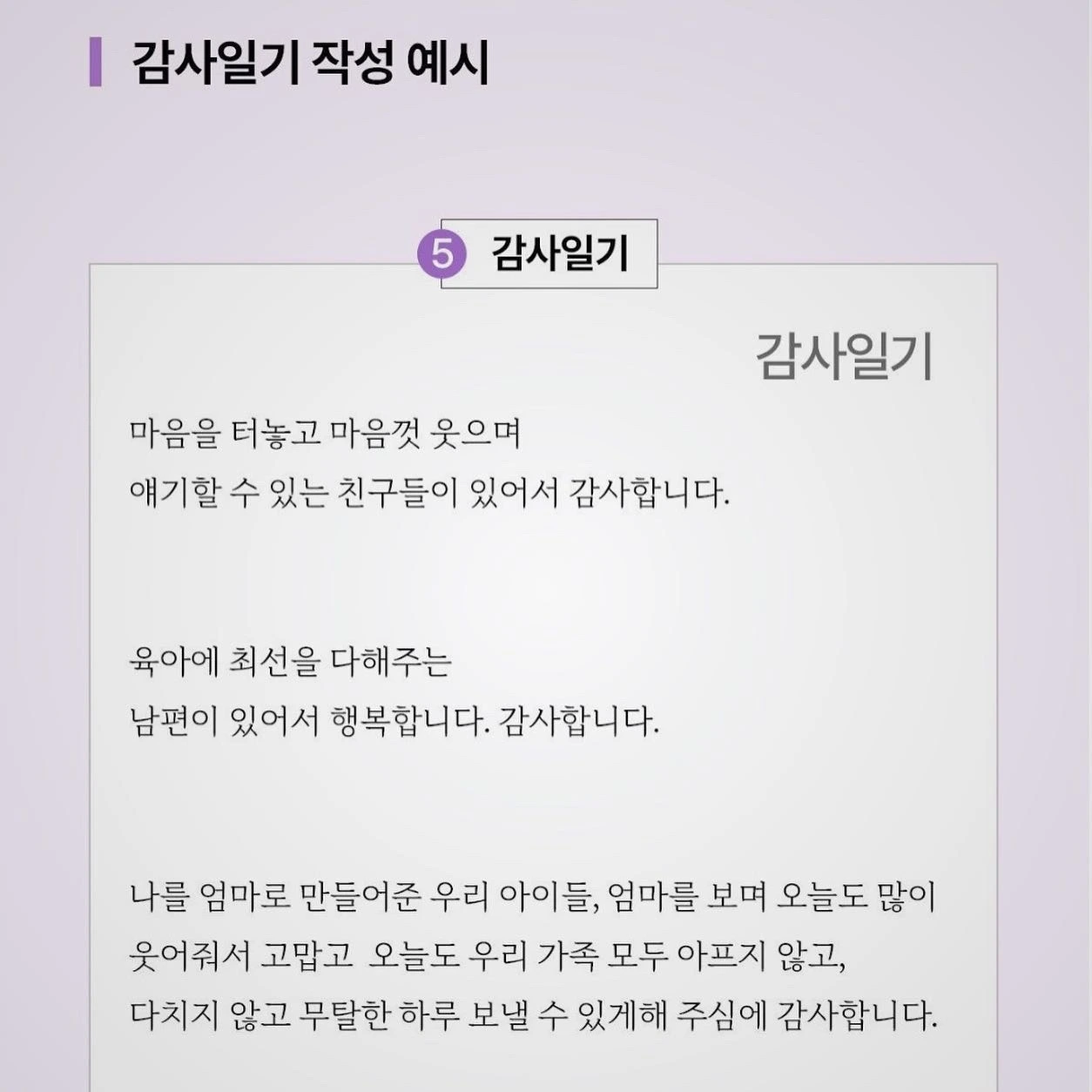 거창하지 않아도 됩니다. 아침에 일어났을 때 자녀의 사랑스러운 미소, 출근길 지하철에서 타인의 자리 양보. 비가 온 뒤 상쾌한 공기를 마신 것, 아름다운 일몰을 본 것, 맛있는 식사 등 오늘 하루 나의 순간을 더 행복하게 만들고, 의미 있게 만든 사람과 사건을 떠올리며 적어보세요.