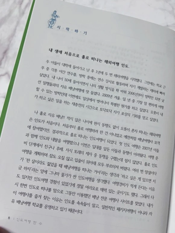 남미, 중미, 아프리카 대륙까지, 그녀가 흔적을 남기고 간 나라만 70여 개국에 달한다. 그 수많은 발자취 속에서 인도 여행을 인생 여행으로 꼽는 작가. <인도 여행의 한 수>는 그래서 탄생하지 않았을까.