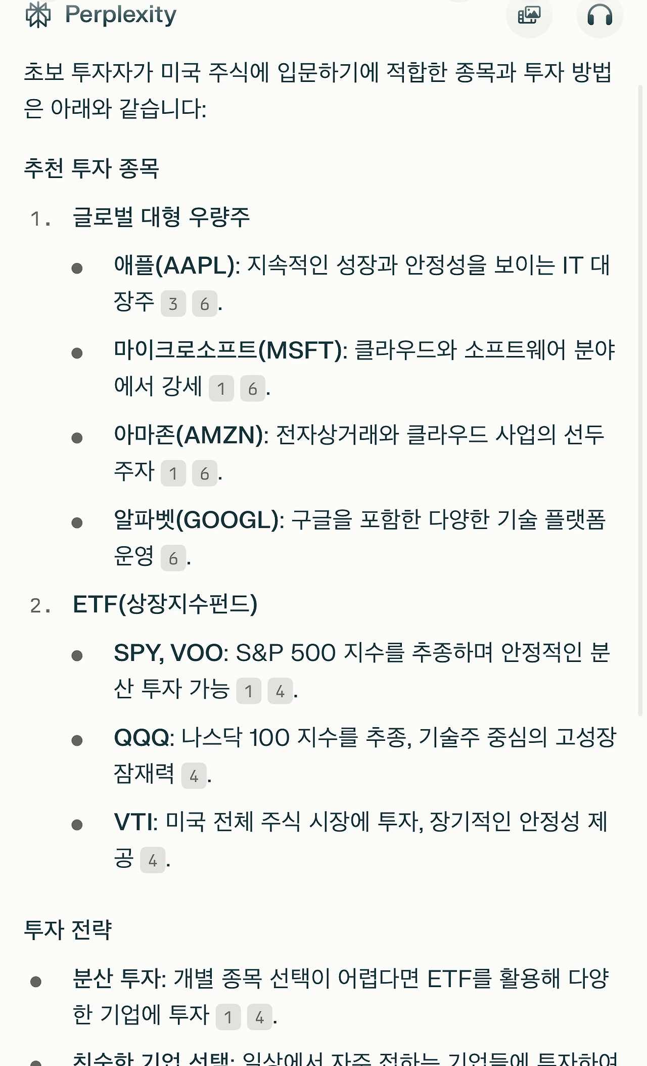 또 해외 주식에도 관심은 많고, 실제 소액 투자 중이기도 한데, 뭘 알아야 투자를 하죠^^;; 그런데 "주식 초보가 입문하기 좋은 미국 투자 종목"을 물어봤는데, 순위와 이유까지 깔끔하게 정리해 줘서 신기하더라고요.