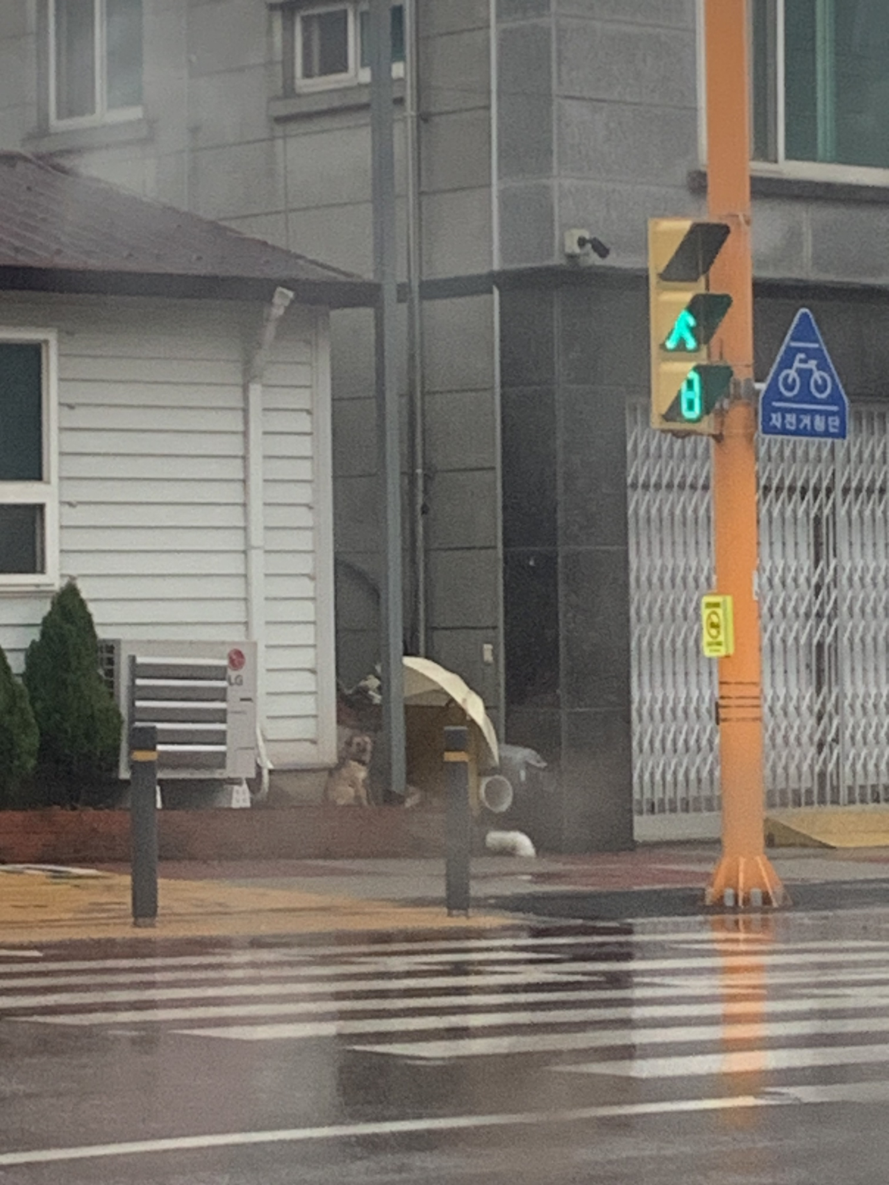 차에서 신호를 기다리며 멀리 내다보니, 강아지는 비를 그대로 맞으며 그 자리에 있었다. 우산 밖으로 몸이 반쯤은 나와 있었다.