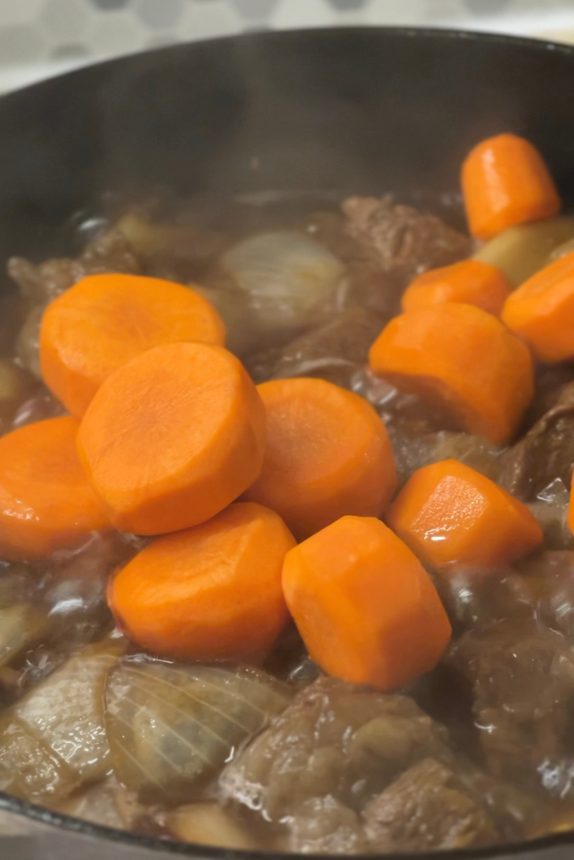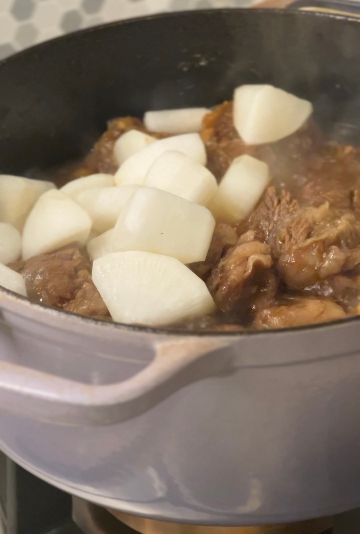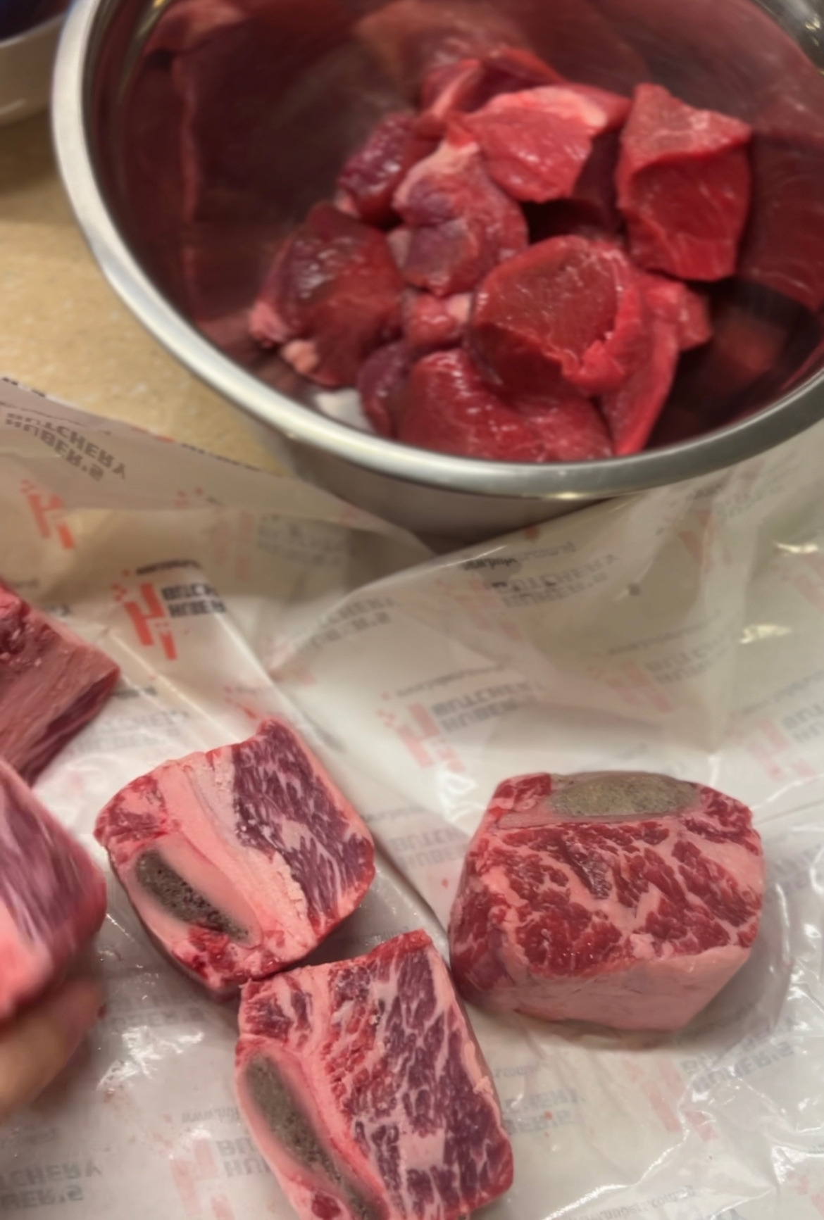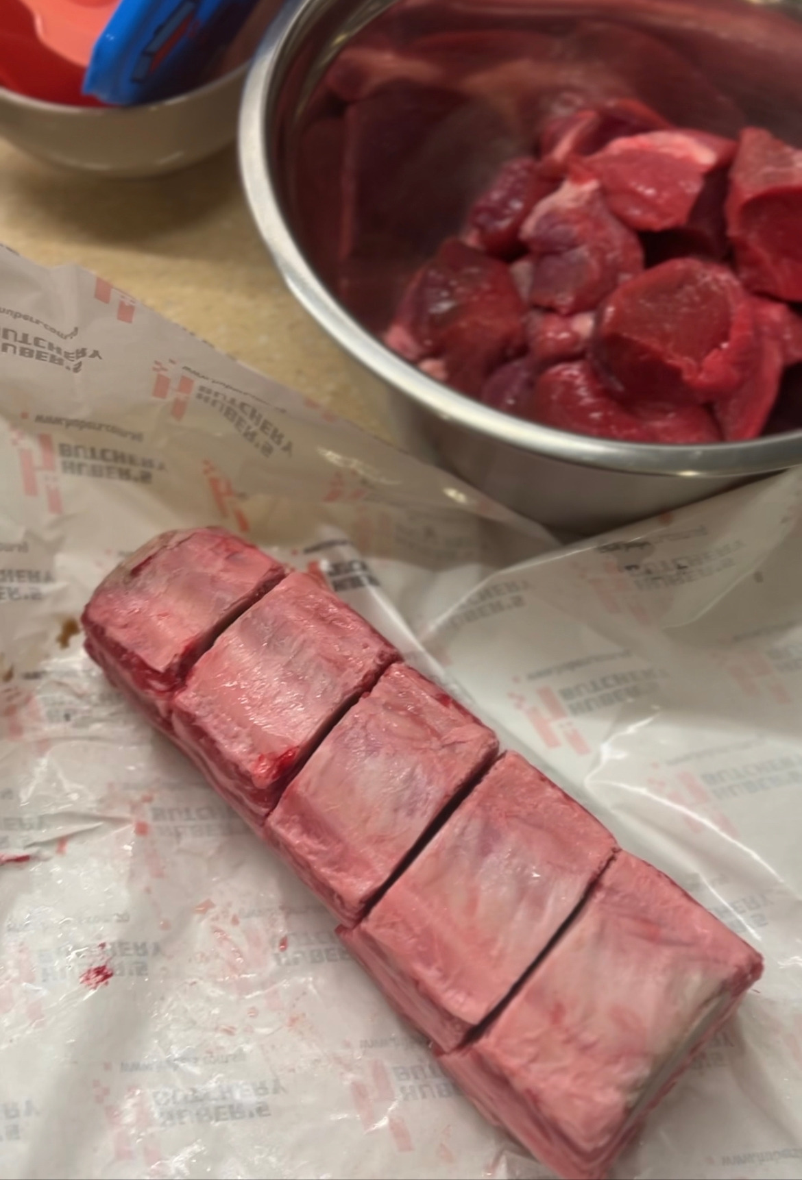 내가 좋아라 하는 정육점에 가서 이들은 바베큐로 구워 먹는 긴 갈빗대를 가리키며 '이거 한대만 이만한 사이즈로 컷' 해달라고 하고 나머지는 스튜용 비프를 한 뭉텅이 사 왔다. 이렇게 700G씩 대략 1.4KG을 맞춰서 받아 들고 와서 핏물을 뺀다.