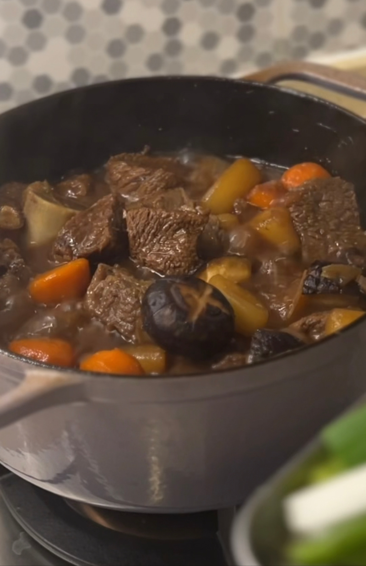 B - "그래서 올해는 생략 ㅋㅋㅋ 언니 나 오늘 후버스 가서 갈비찜고기 사왔잖아~ ㅎㅎㅎ 고기 진짜 좋더라~ Short rib이 있길래 그거 한 대 컷 해달라고 하고 나머지는 스튜용으로 살코기만 샀지.
