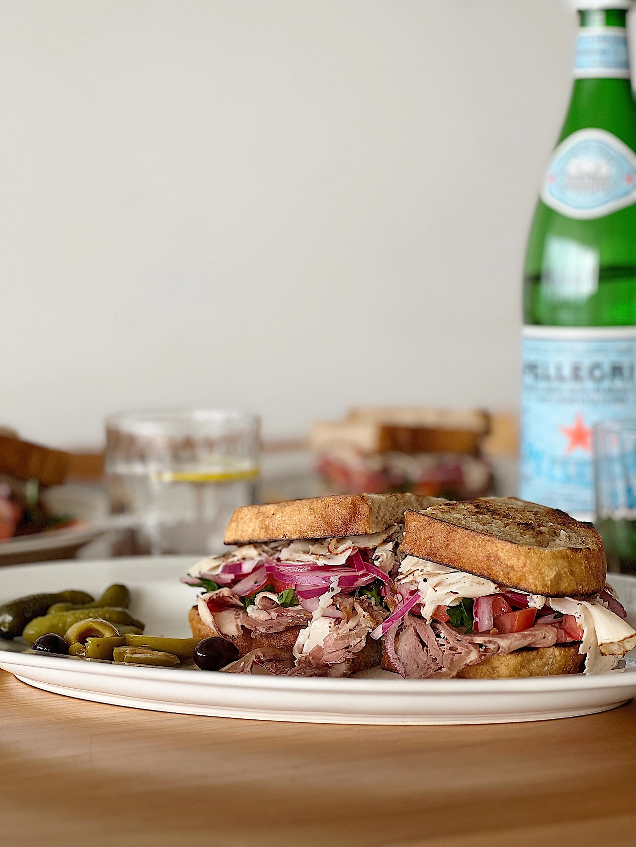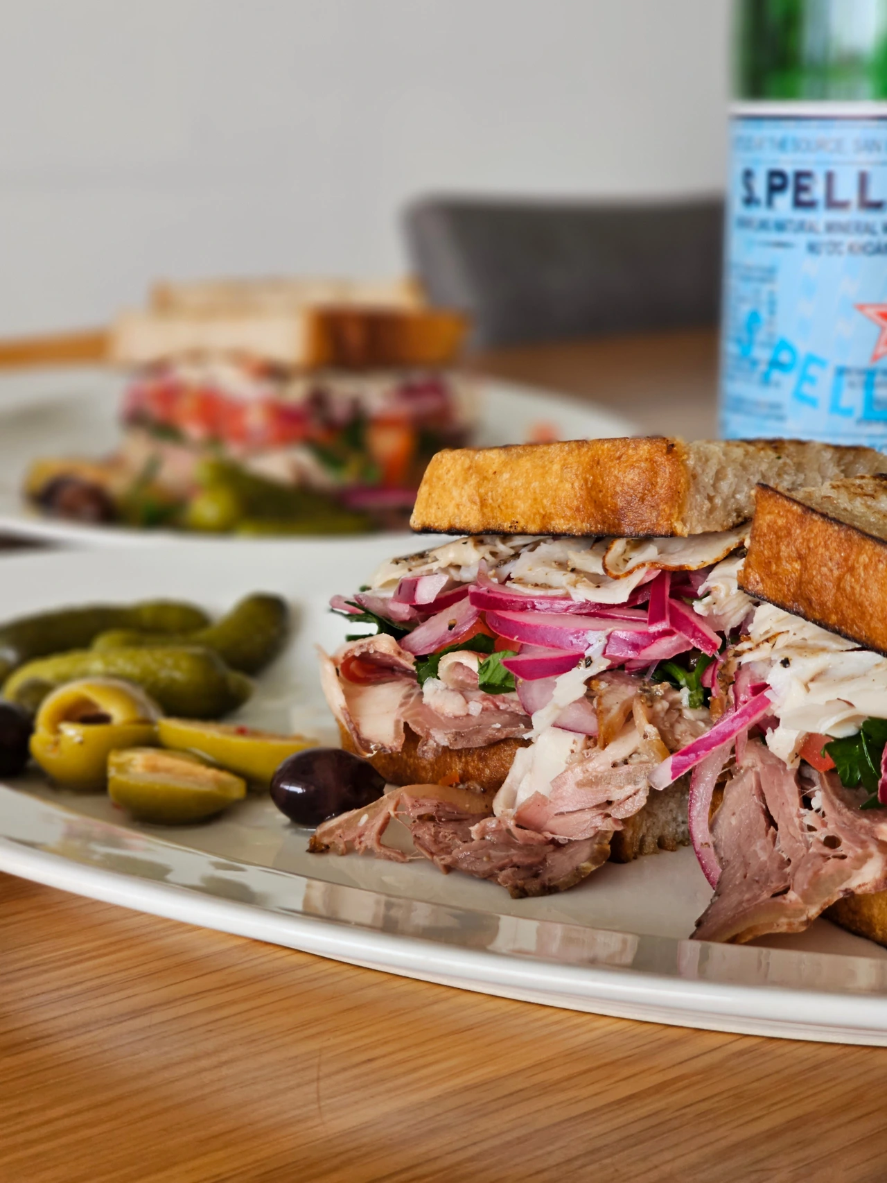 7. 비프햄, 파슬리, 토마토, 적양파, 터키햄 순으로 쌓고 빵을 하나 더 올려서 끝!