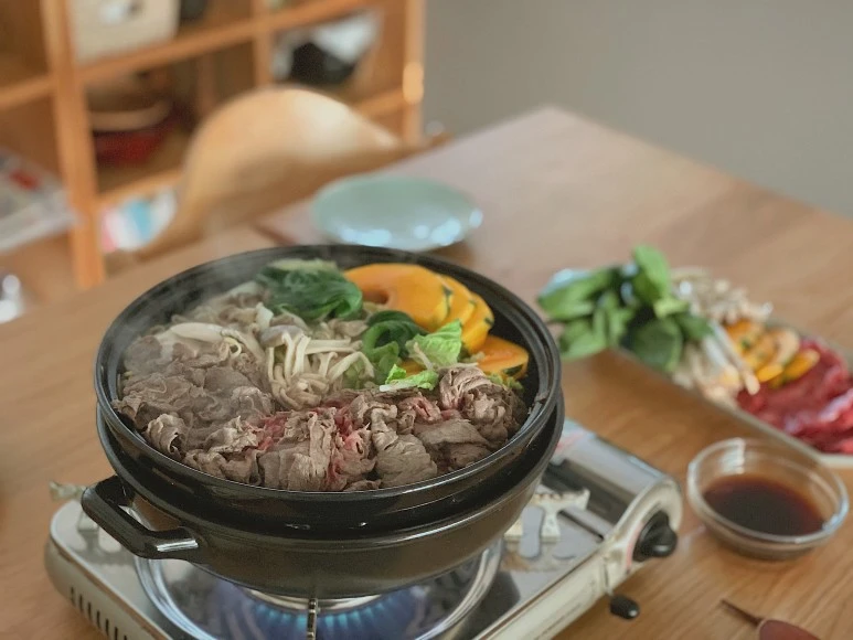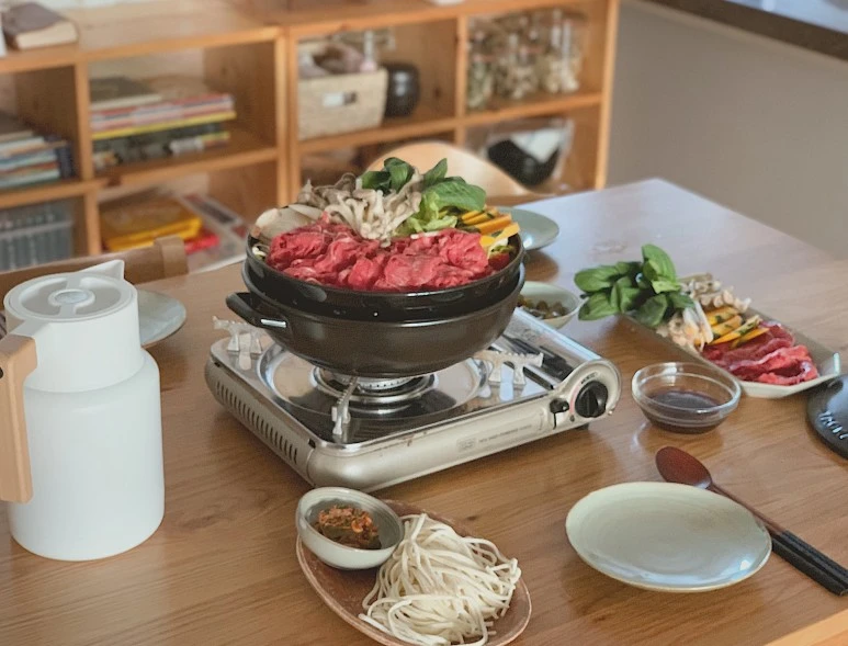 이렇게 예쁜데 찜기까지 합쳐있으니 어찌 안살수가... 일반적인 뚝배기와는 다르게 세제를 흡수하지 않아 세제사용이 가능하다는 말에 잽싸게 집으로 들인 뚝배기였다. 활용도가 정말 좋은 냄비! 내가 이 냄비로 자주 이용하는 방법은 아래에 육수를 두고 찜기에 새우,고기와 채소들 넣고 익힌 후 소스에 찍어먹고 육수에는 칼국수 면을 삶아서 먹는다. 샤브샤브로 먹는것도 맛있지만 따로 쪄서 먹으면 더 깔끔한 맛을 즐길 수 있다.