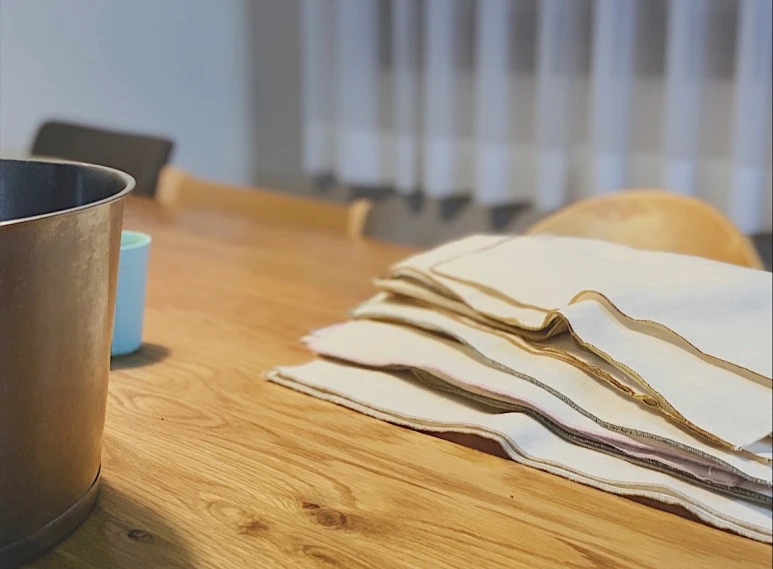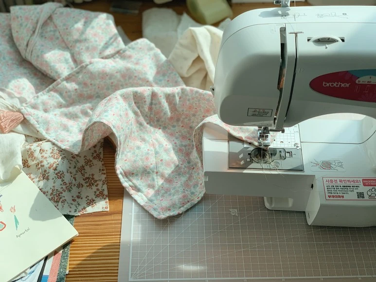 일단 원단을 잘랐다. 광목으로도 만들어보고 거즈로도 만들고 소창으로도 만들며 여러 가지를 만들어 써보면서 정착한 원단이 바로 거즈와 소창이다. 쓰다가 찢어지면 또 만들고 얼룩이 안 빠지거나 가끔 태워먹으면 또 만들고.. 주기적으로 꾸준히 미싱을 돌돌돌 돌린다.