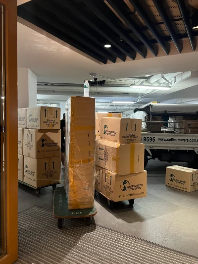 나무 판때기 카트로 이사박스를 모두 옮겨서 지하 주차장에 주차된 작은 트럭에 싣고 그 트럭으로 바깥의 큰 이사트럭에 짐을 옮겨 싣는다.