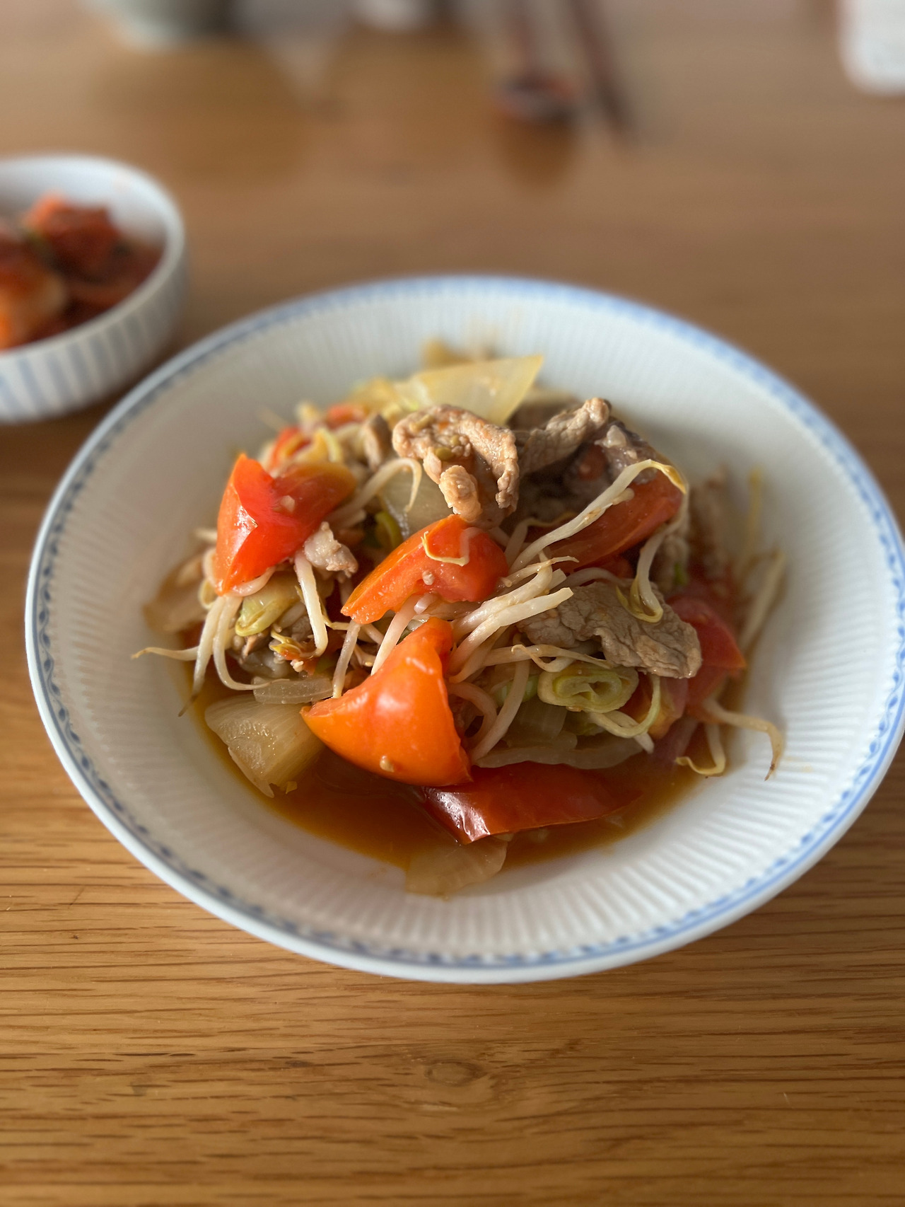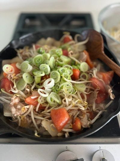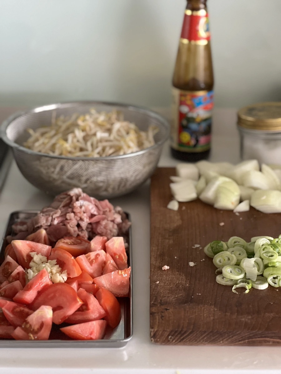 재료 - 돼지고기, 토마토, 다진 마늘, 숙주, 양파, 파, 굴소스, 참치액젓, 소금