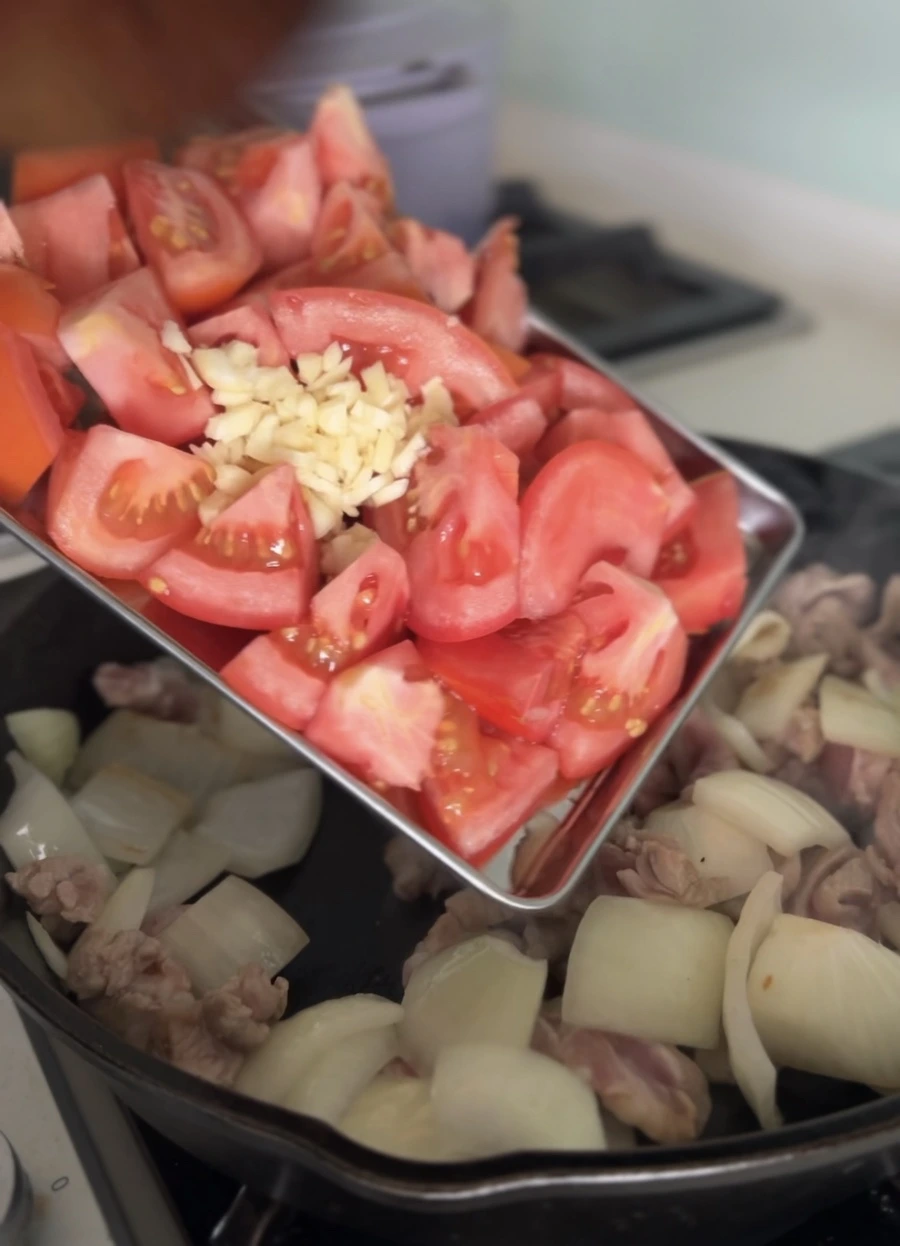 1. 돼지고기는 제육용으로 준비하고 토마토는 큼직큼직 뭉텅하게 썰고 양파도 큰 깍둑썰기로 썰어준다.