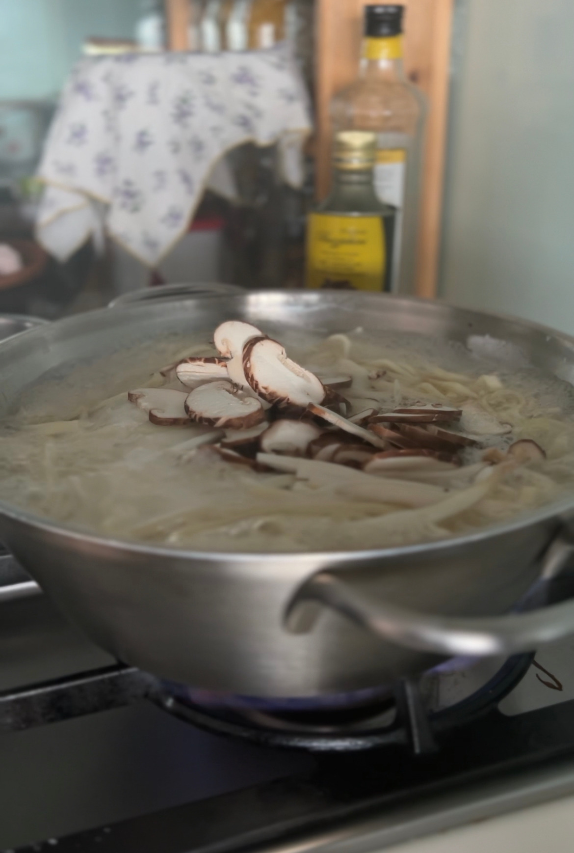 3. 물이 끓으면 냉동새우를 넣고 다시 끓어오르면 칼국수면과 버섯을 넣는다.